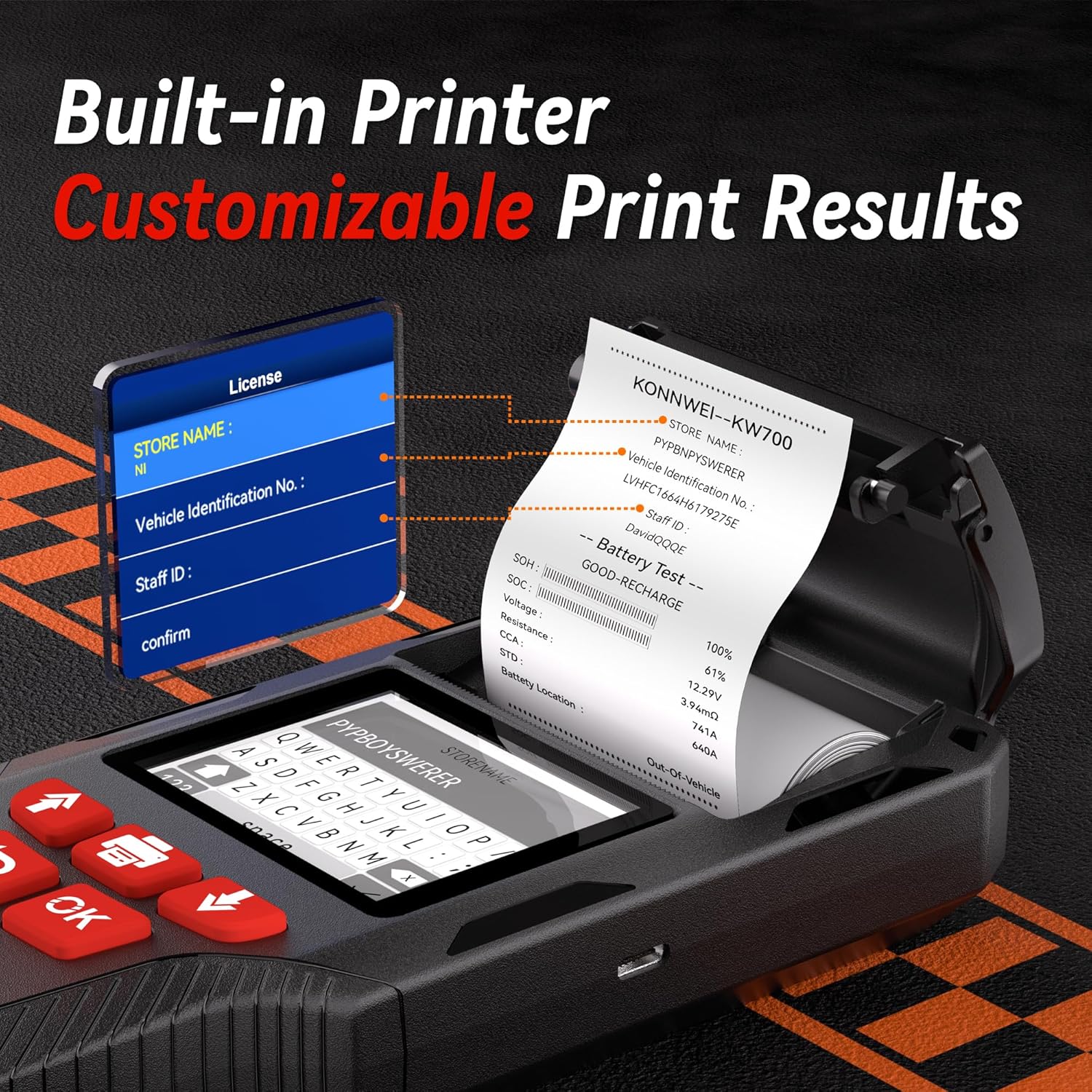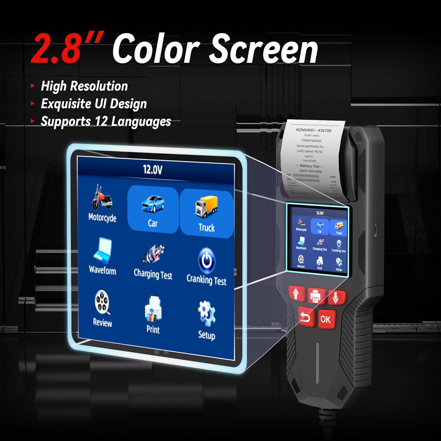 - 【12V/24V Battery Health Analysis Tester】KW700 battery tester with printer delivers diagnostics for 12V/24V batteries. Works on sedans, trucks, RVs, boats, golf carts, lawn mowers, heavy-duty equipment etc. Test battery health, alternator output, and starter performance in seconds with high accuracy. Covers regular flooded, lead acid, AGM, GEL, EFB, and lithium batteries—no more guesswork!