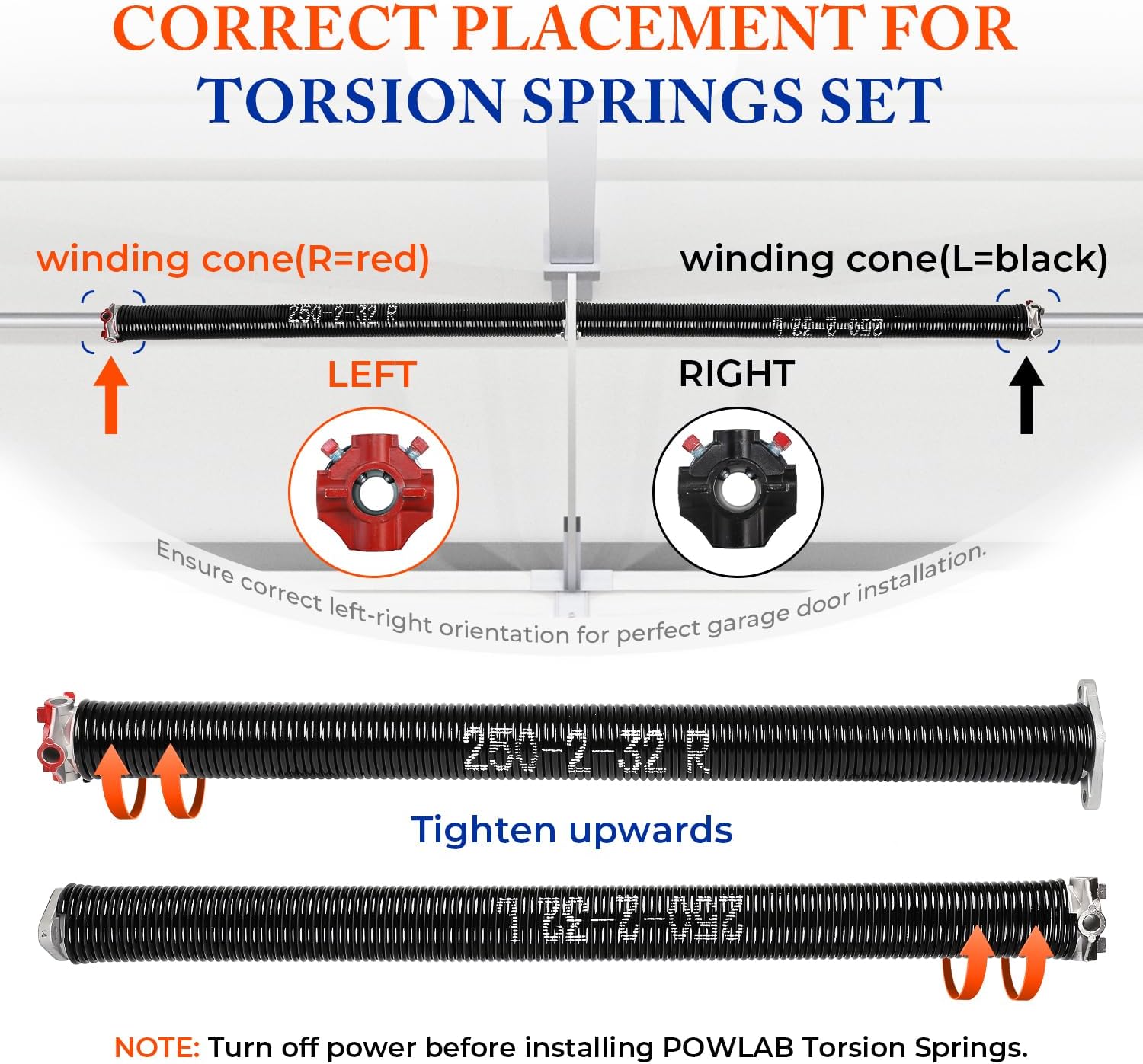 - IMPORTANT INSTALLATION NOTE: The black end of the spring is marked with "L" and the red end with "R." When viewed from outside the garage looking in, the black "L" should be installed on the left side and the red "R" on the right side. When viewed from inside the garage looking out, the red end (R) should be installed on the left side and the black end (L) on the right side. Incorrect installation may cause malfunction. To ensure proper installation, please consult the manual, watch our video tutorials, or seek professional installation services. Contact us for support if needed.