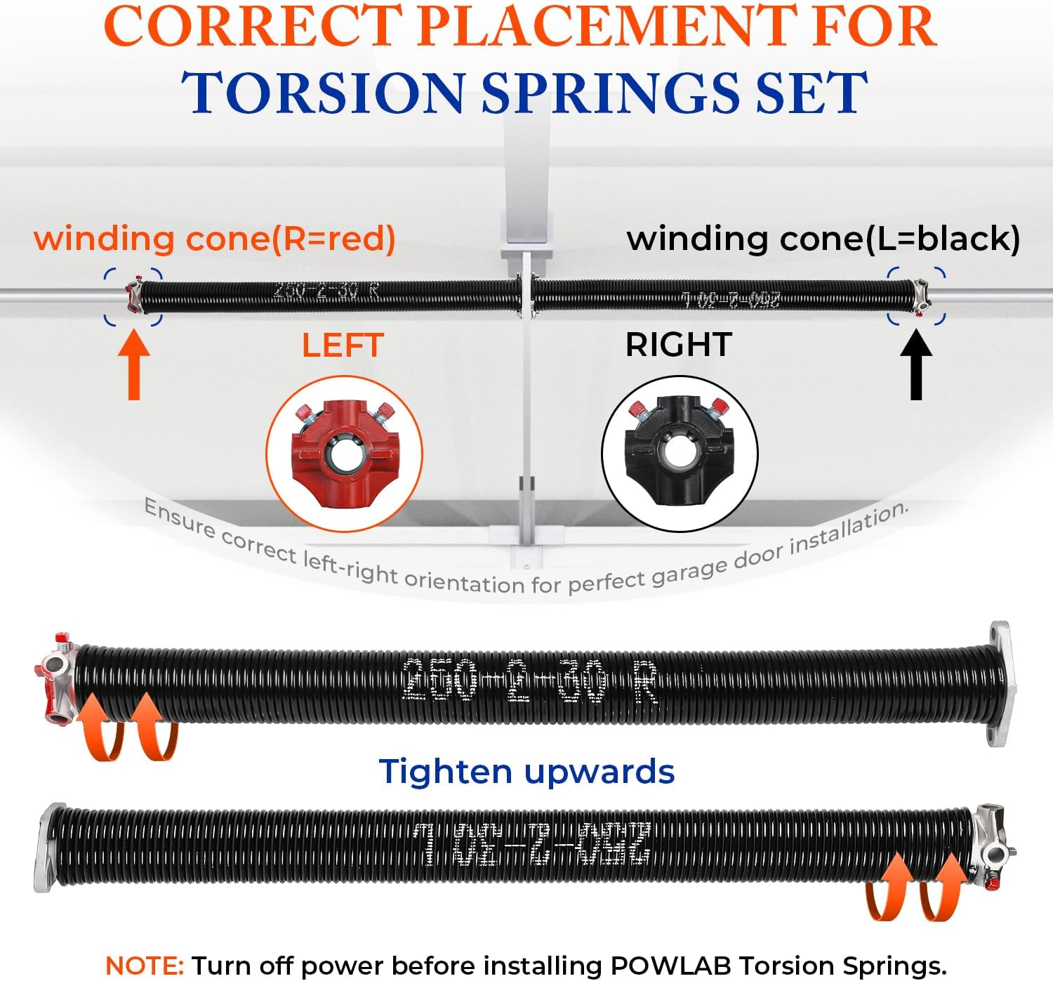 - IMPORTANT INSTALLATION NOTE: The black end of the spring is marked with "L" and the red end with "R." When viewed from outside the garage looking in, the black "L" should be installed on the left side and the red "R" on the right side. When viewed from inside the garage looking out, the red end (R) should be installed on the left side and the black end (L) on the right side. Incorrect installation may cause malfunction. To ensure proper installation, please consult the manual, watch our video tutorials, or seek professional installation services. Contact us for support if needed.