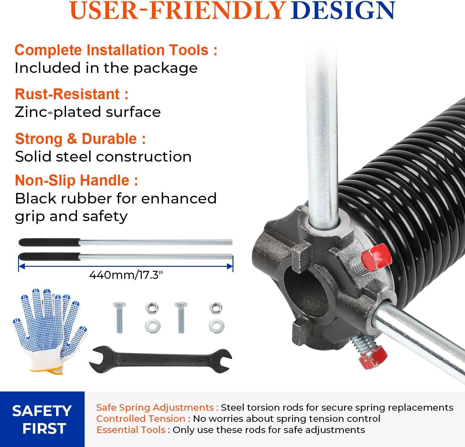 - COMPLETE INSTALLATION KIT: Includes a pair of 2" torsion springs, 17.2" non-slip winding bars, anti-slip gloves, screws, a wrench, and a user manual. Everything you need for a hassle-free installation is provided.Use our high-quality garage door torsion springs to replace old, broken springs and save money with a simple installation process.