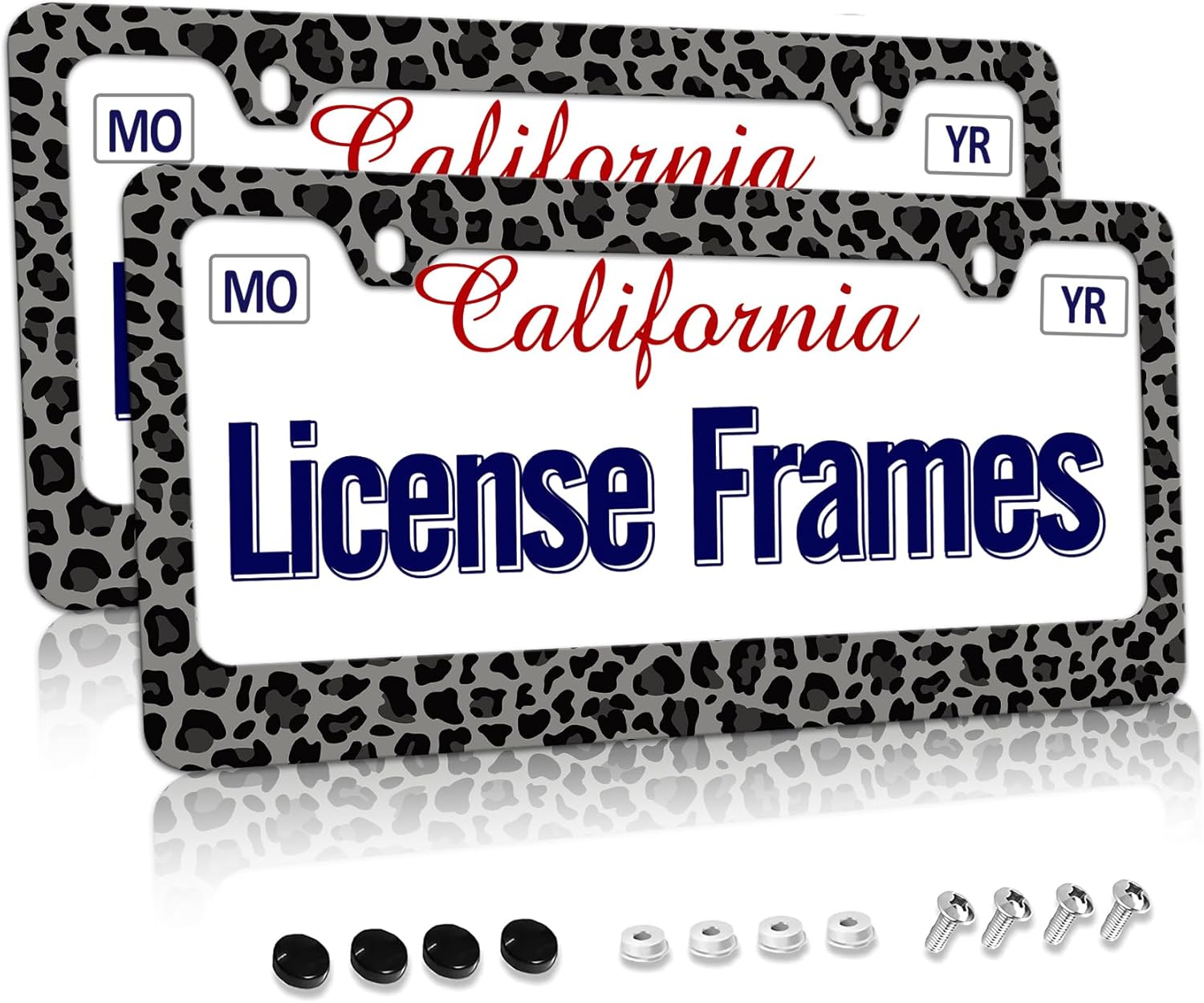 - Standard Size:This 2-hole leopard license plate frame measures 12.3"X 6.3"to fit all standard size U.S.license plates and protects the front and rear panels of the vehicle.The narrow border of the license plate frame does not obscure the status label or cover the state name of the license plate.