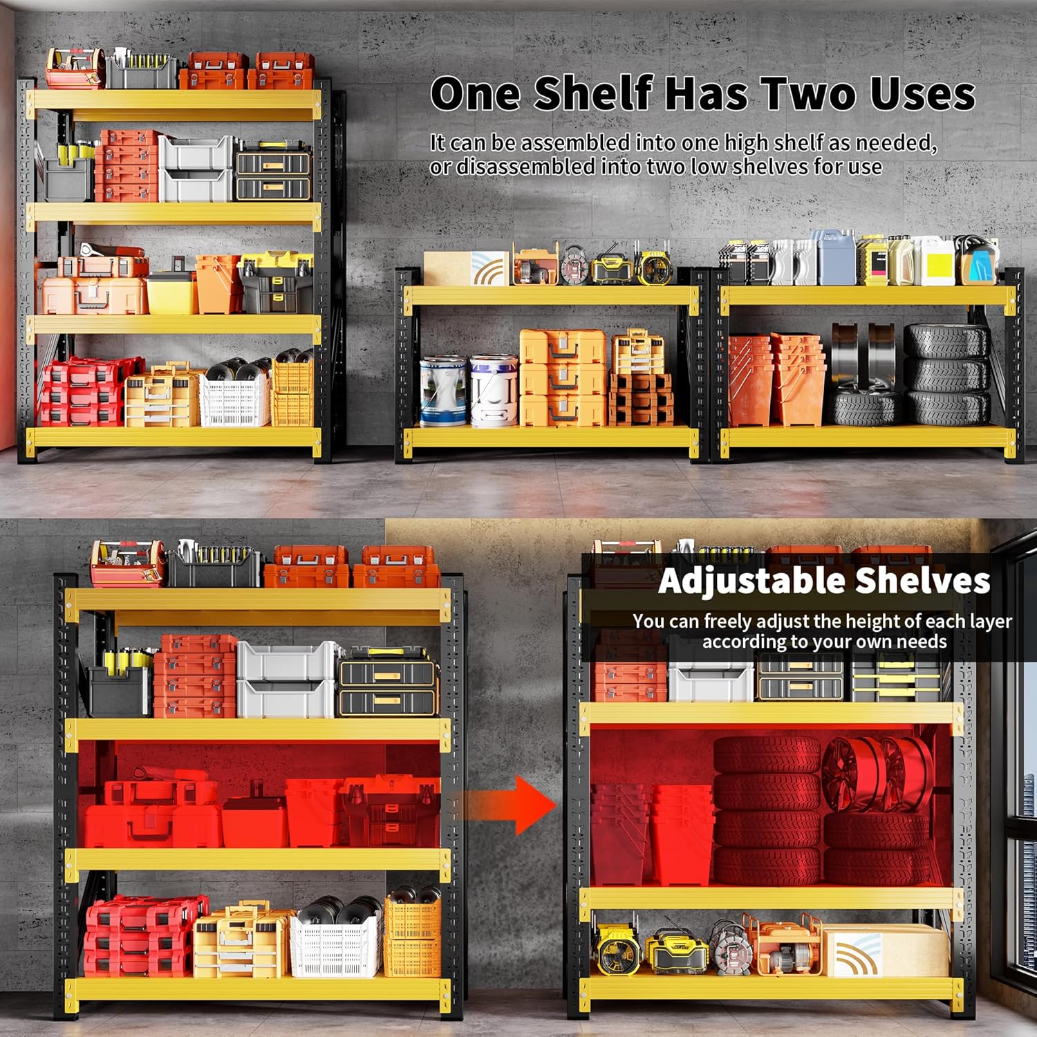 - Adjustable Metal Shelves: Our metal shelves are adjustable. You can adjust the height of the shelves according to your needs. At the same time, you can also divide the high garage storage rack into two low ones to meet your storage requirements. The heavy duty garagre shelving is very suitable for garage storage and organization.