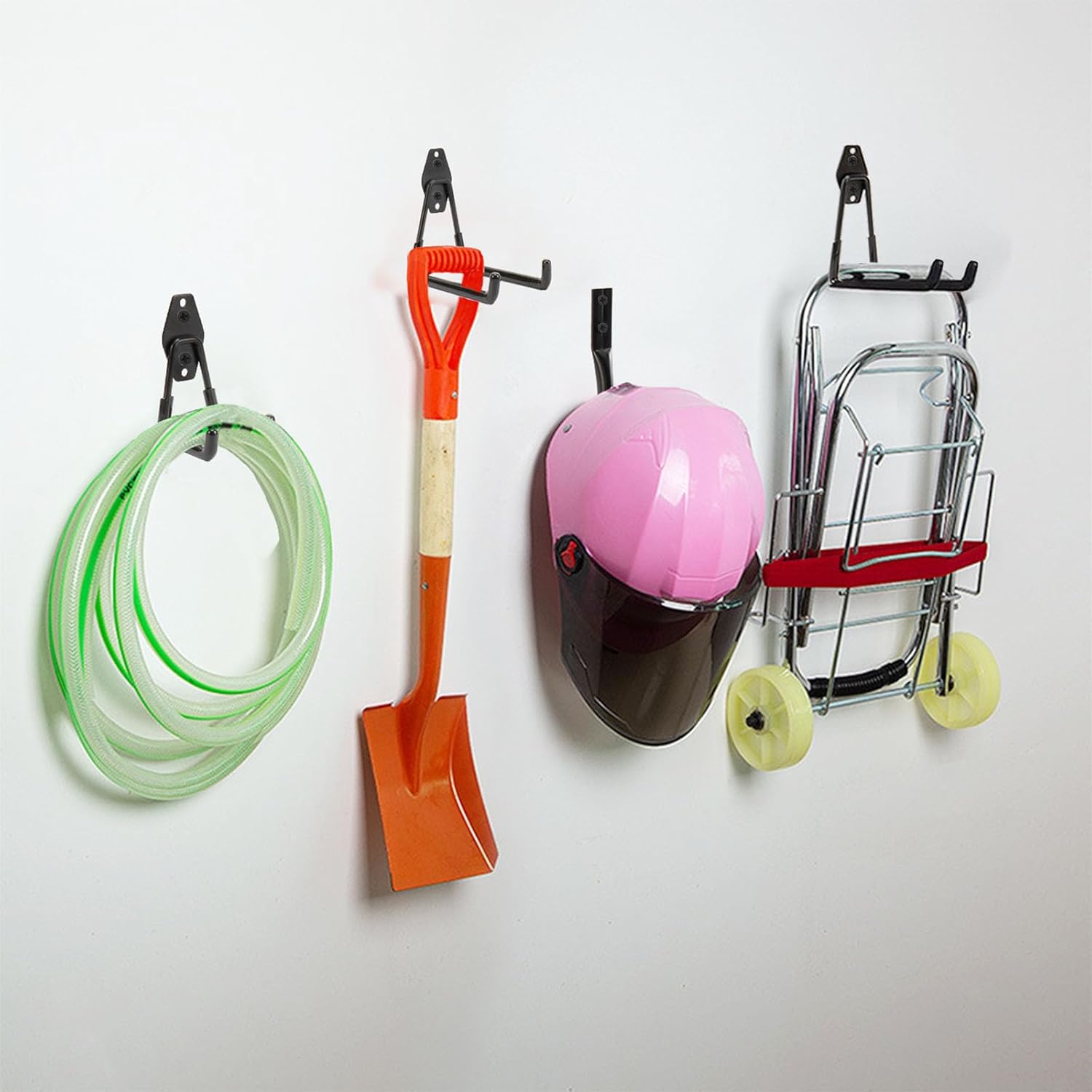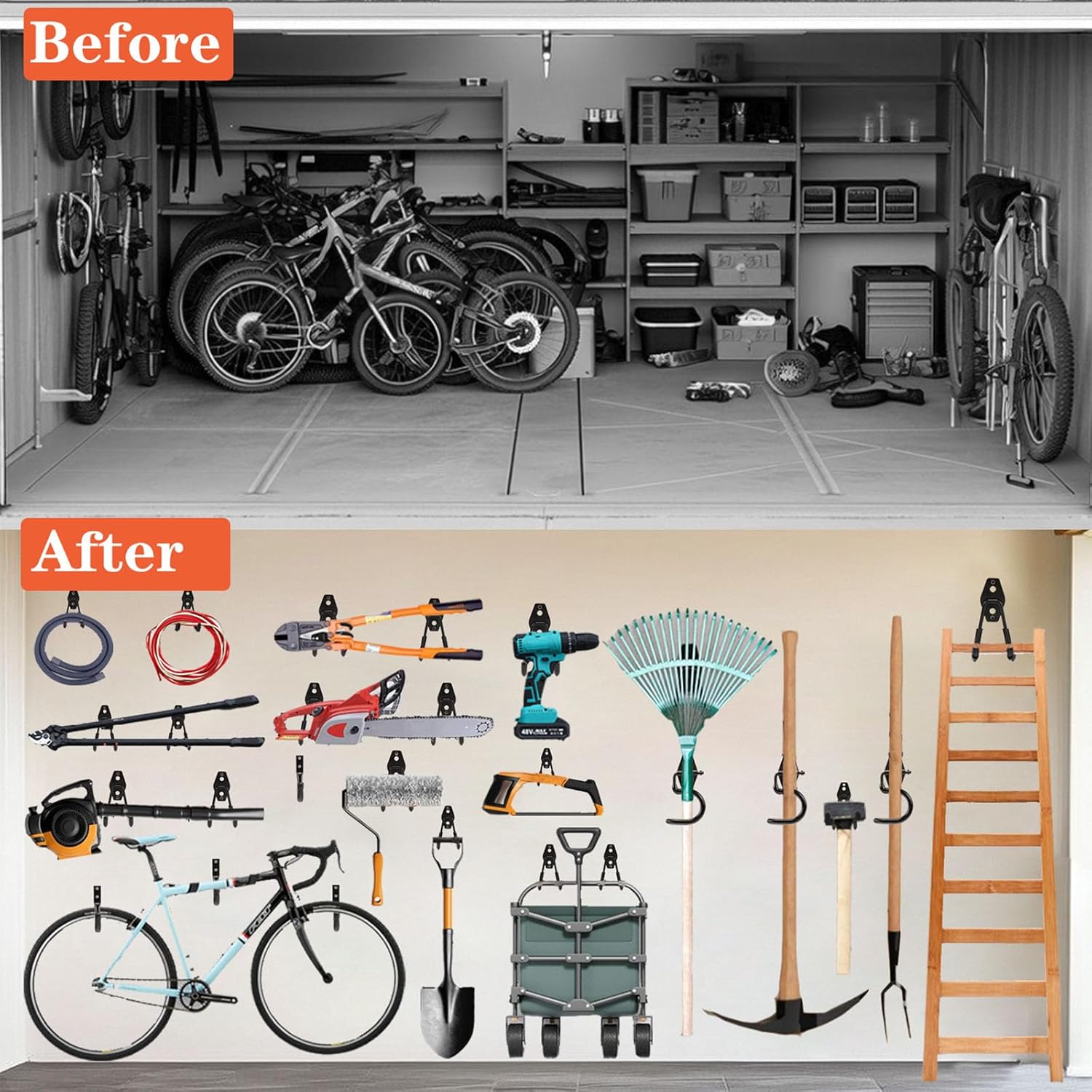 - Efficient Storage Function: Garage tools holder helps you make full use of vertical storage space, frees up floor space, and allows you to quickly find what you need. Utility organizer are perfect for hanging ladders, power tools, bicycles, shovels, brooms, fold-able chairs, skates, gym bags, spades, rakes, kayaks, sports equipment, strollers, blowers, and other heavy-duty items.