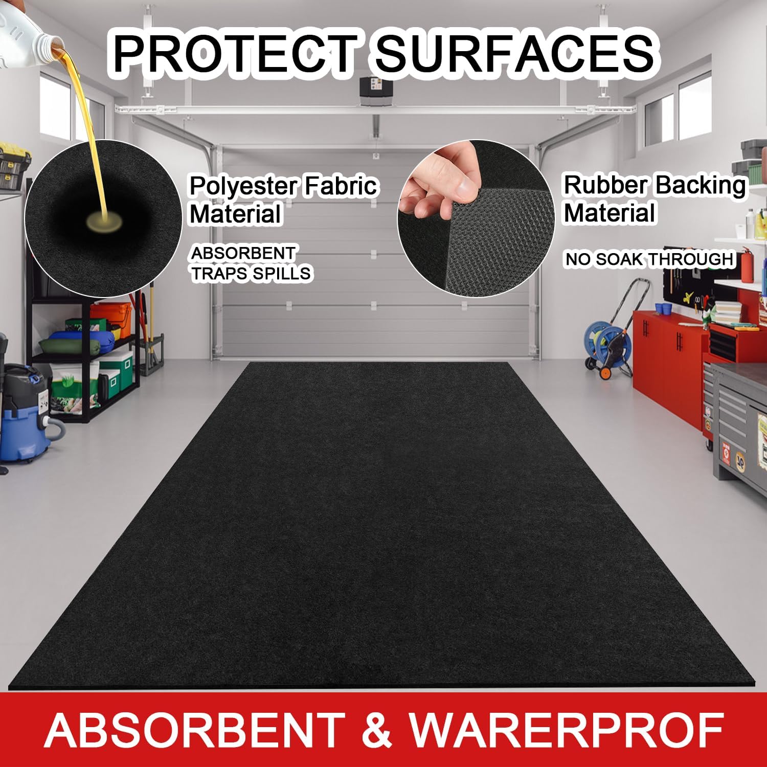 - ๐๐๐ฌ๐จ๐ซ๐๐๐ง๐ญ & ๐๐๐ญ๐๐ซ๐ฉ๐ซ๐จ๐จ๐ ๐๐ซ๐จ๐ญ๐๐๐ญ๐ข๐จ๐ง๏ผThis garage floor mat features a super absorbent surface that traps oil, brake fluid, and other spills, while the waterproof rubber backing prevents leaks from reaching your floor. Perfect for use as an oil spill mat for garage floor under cars, motorcycles, or trucks.