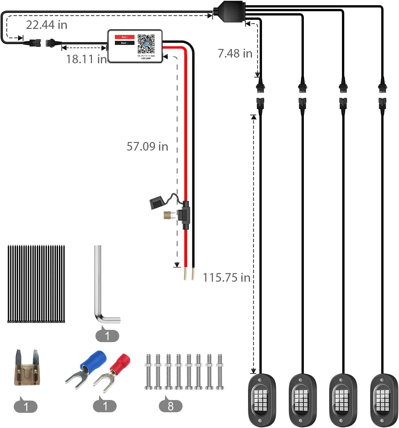 - Included Components : RGB Rock Lights Pods, Control Box, Heat Shrink Wire Connectors, Fuse Holder, Blade Fuse, Zip Ties, Screws, Allen Wrench RGB Rock Lights Pods, Control Box, Heat Shrink Wire Connectors, Fuse Holder, Blade Fuse, Zip Ties, Screws, Allen Wrench