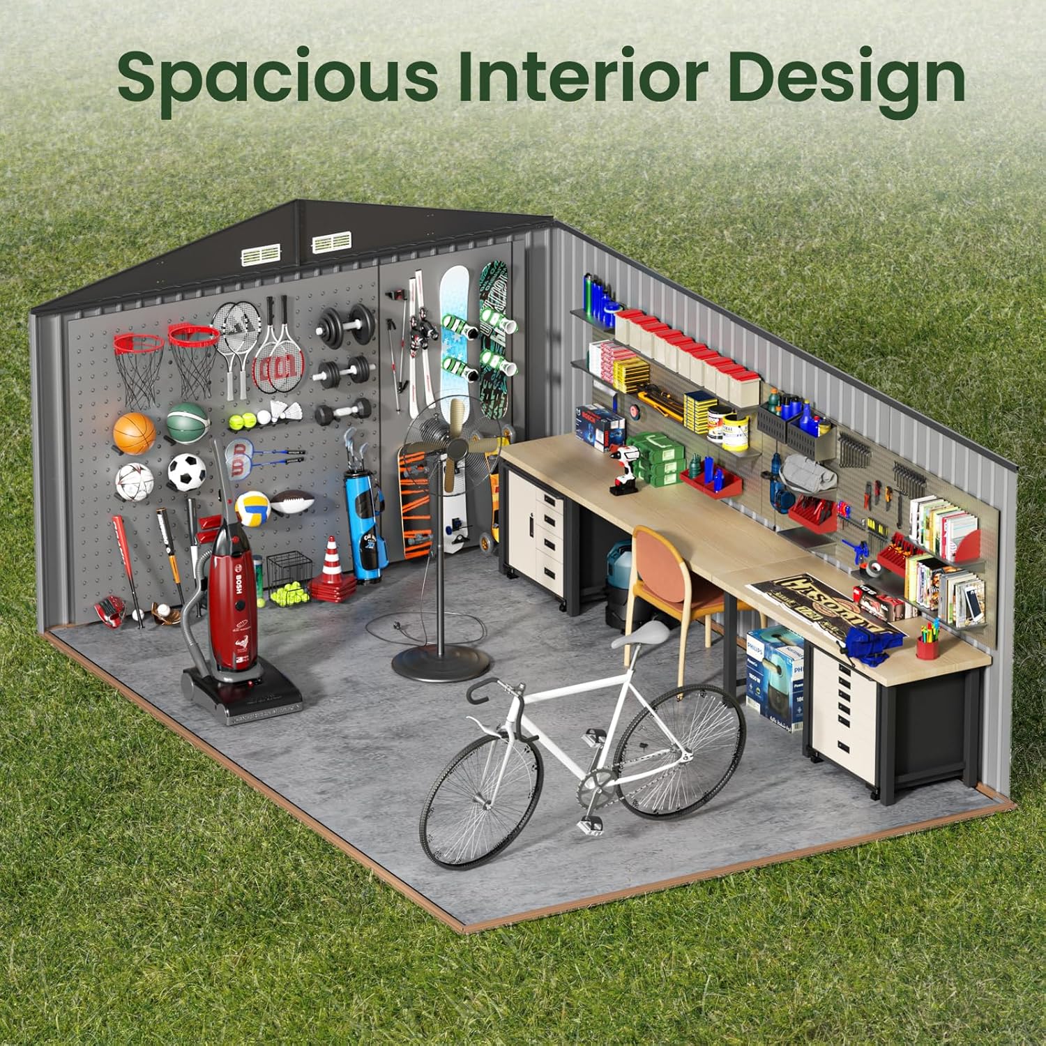 - This versatile outdoor storage shed accommodates everything from large equipment (snow blowers, lawn mowers) to recreational gear and seasonal items. Keep your backyard tidy and organized by stowing tools, bikes, or even your kids’ toy car securely.