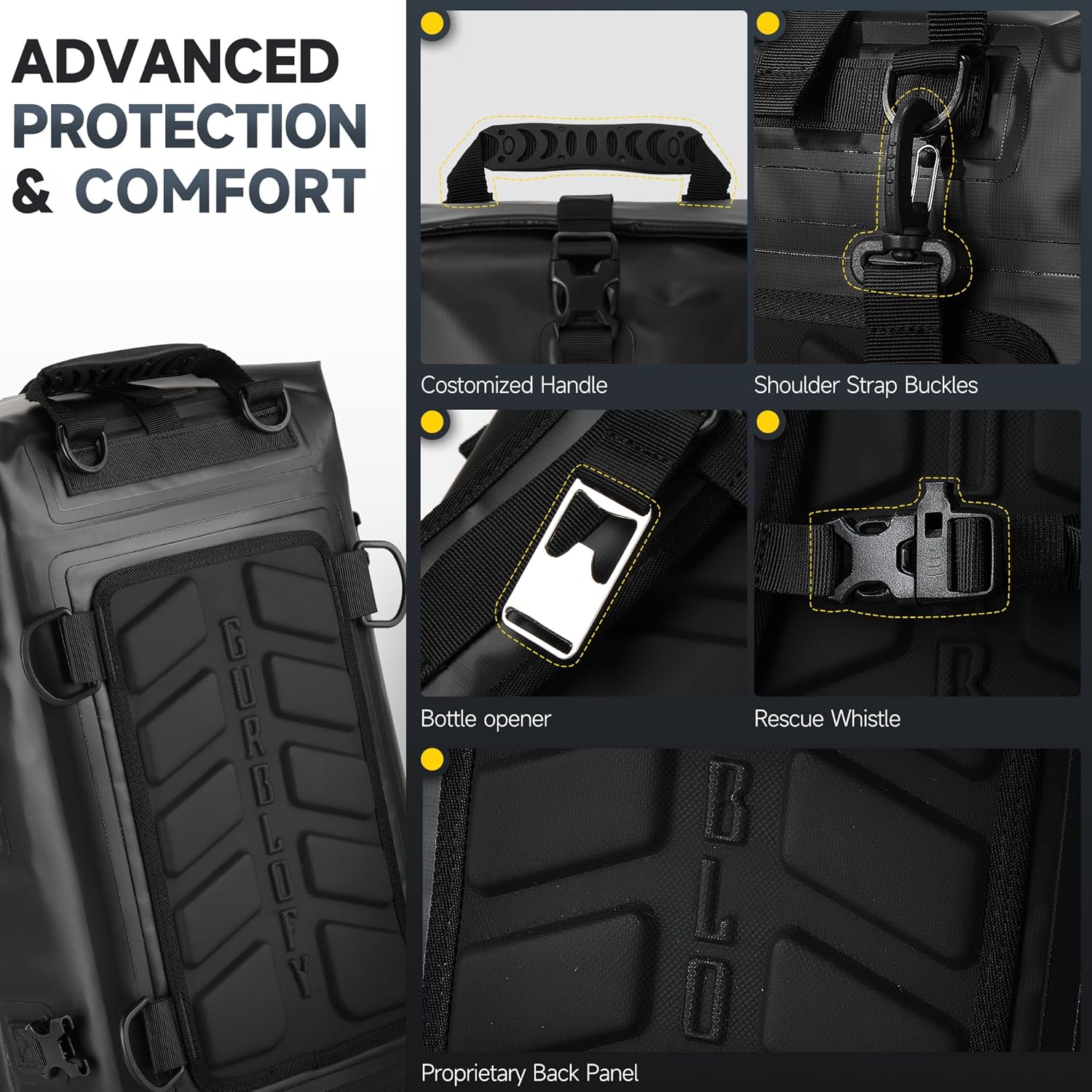 - Uniquely Engineered for Riders – Gurblofy’s Flagship Adventure Series. Engineered with heavy-duty PVC material for ultimate weather protection, this motorcycle backpack combines rugged durability with sleek functionality. Available in two practical sizes - compact 15L (10×6.3×21.65 inches) for daily essentials or spacious 30L for extended adventures.Features three versatile color options: Classic Black, Field Green, and Stone Grey – blending durability with rugged aesthetics.