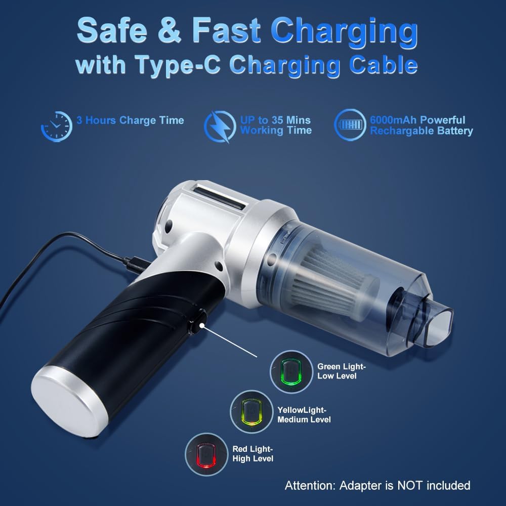 - [Safe & Convenient Charge]- The handheld vacuum cleaner uses a 6000mAh capacity battery and supports the fast Type-C charging. The high compatibility of the charging port makes it convenient for the vacuum to be charged anywhere like at home, in the car or outdoors with your laptop. It usually takes 3 hours to charge the vacuum fully. You can use the fully charged vacuum for up to 35 minutes.