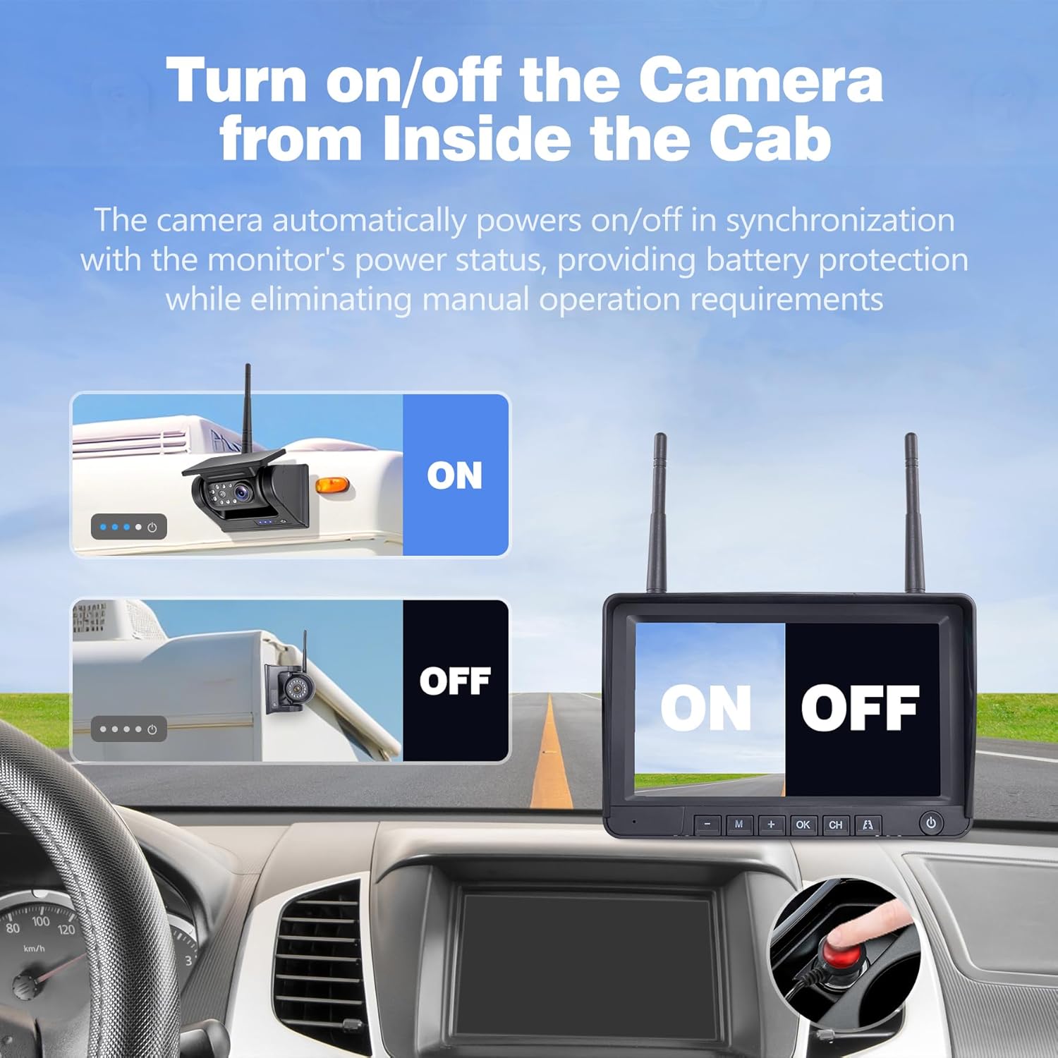 - 【Strong & Reliable Wireless Connection】 Enjoy crystal-clear, real-time video without delays thanks to our powerful 2.4GHz wireless technology with dual antennas. Works flawlessly up to 330 feet away (in open areas) and stays connected even at highway speeds. Perfect for all your vehicles – from daily drivers like cars and SUVs to work trucks, RVs, boats, and heavy-duty trailers. Just install and go – the system automatically maintains a strong signal so you can focus on the road.