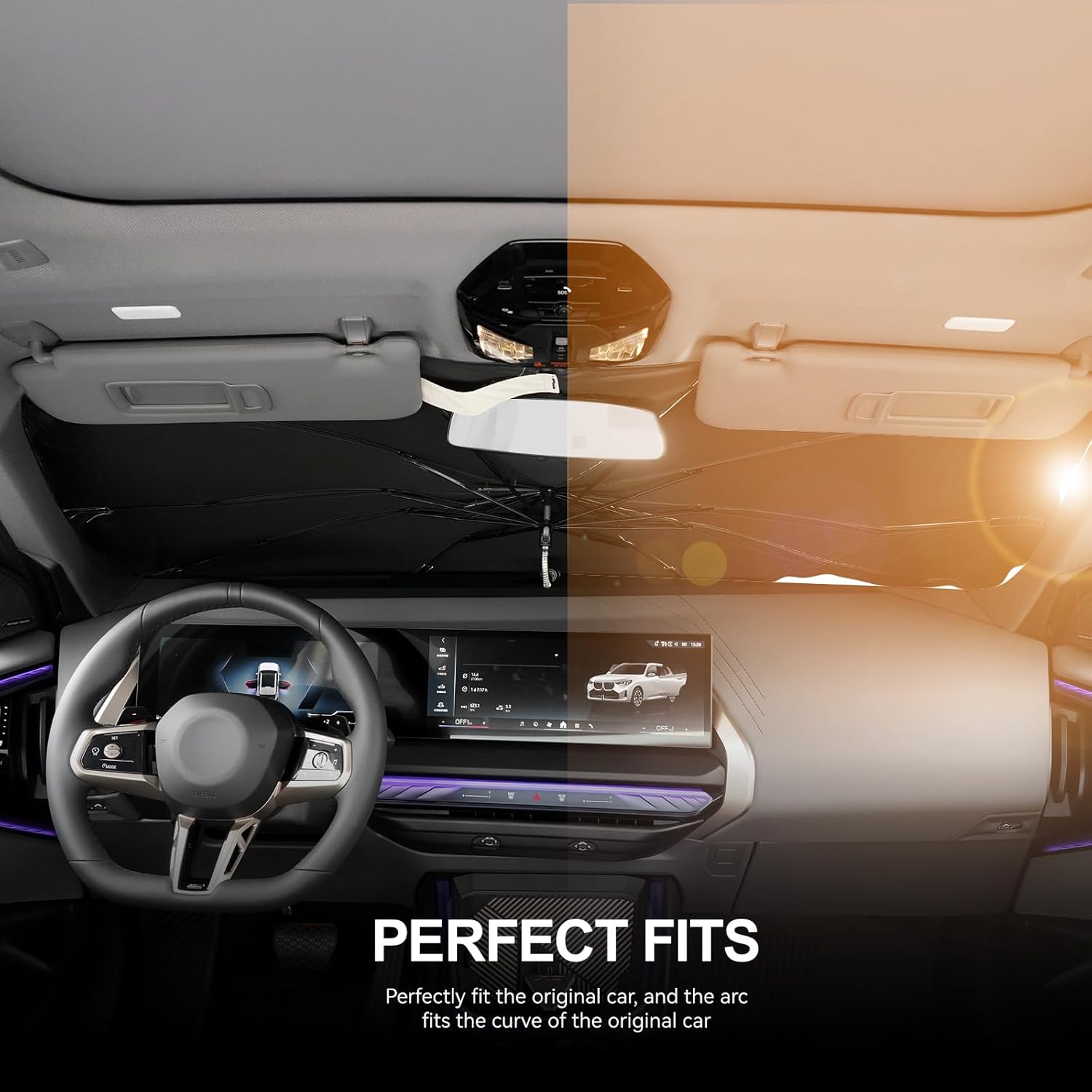 - PROTECTION: Beat the midday heat and glare! Engineered for maximum protection, this windshield sunshade blocks strong sunlight and UV rays, safeguarding your car's interior and keeping you protected. Step into a cooler, shaded car every time, enjoy every comfortable journey.