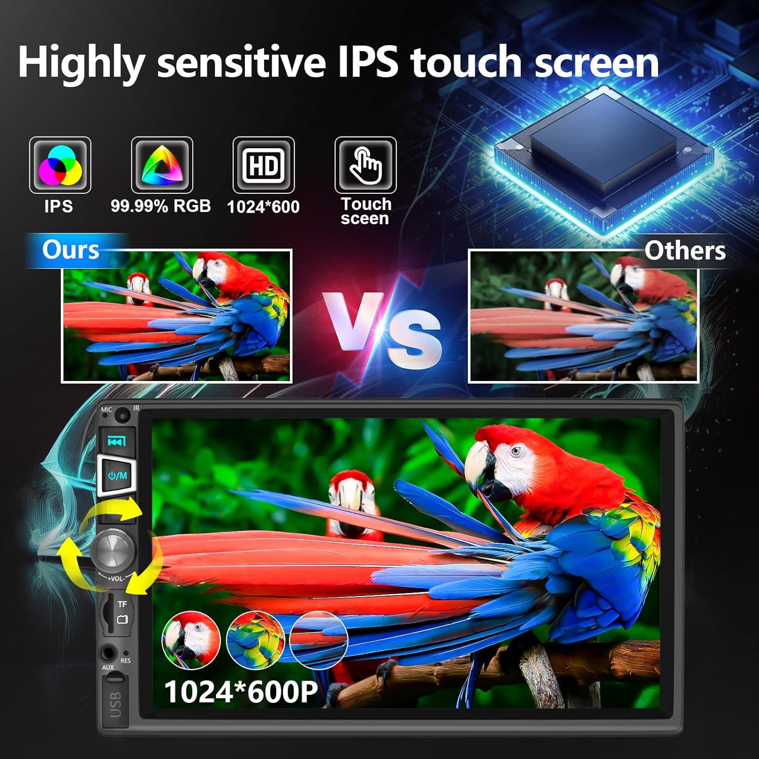 - 【Bluetooth 5.2 and 1024*600 HD Touch Screen】: When your phone is connected to Bluetooth, you can turn on the hands-free system, free your hands when answering phone calls, and listen to Bluetooth music and more! This unit supports dual control modes of physical buttons, knobs and touch screen, 7-inch 1024*600 HD capacitive touch screen, more sensitive and accurate, while supporting 1080P video playback visual experience!