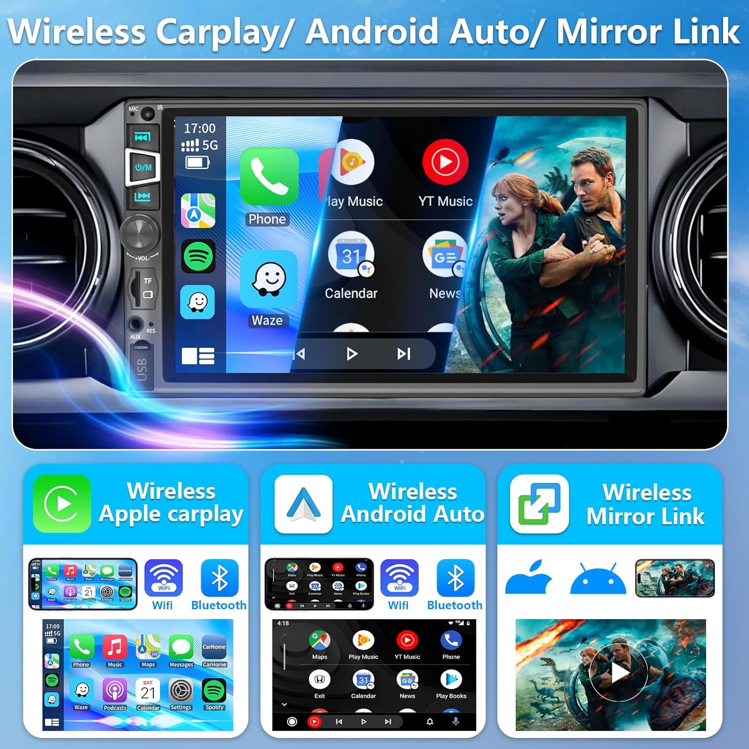 Double Din Car Stereo Compatible with Wireless Carplay&Android Auto&Mirror Link,7 Inch HD 1024 * 600 Touchscreen with Bluetooth 5.2,Backup Camera Input,Voice Control,USB/AUX/TF/SWC/MIC,AM/FM Radio
