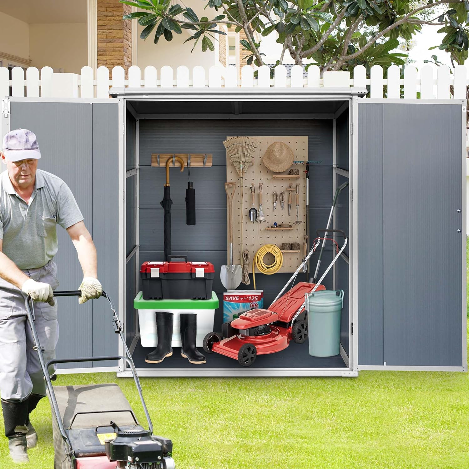 - High-Quality Durable Material: This vertical outdoor storage shed is crafted from premium resin material, specifically designed for outdoor use. It effectively resists rain, UV rays, and temperature fluctuations, preventing cracking and fading. This enhances the durability of your tool shed, ensuring it withstands various weather conditions and protects your tools and equipment