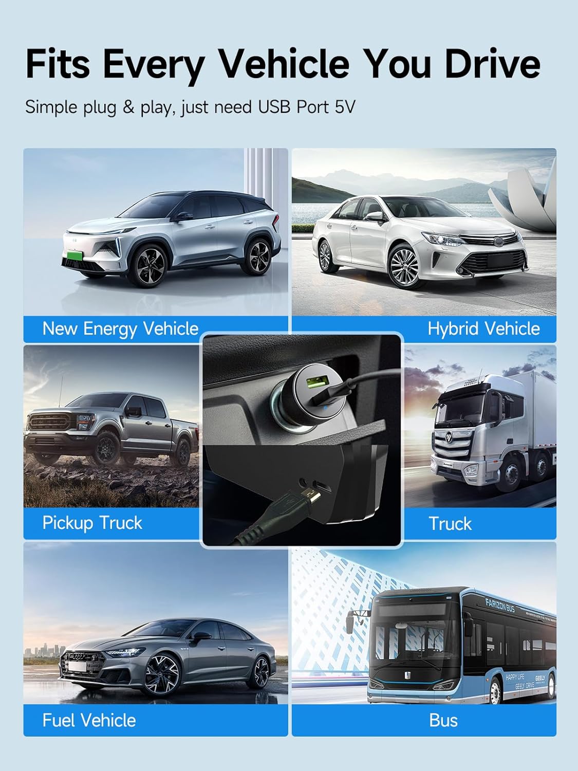 - Easy to Install &Suitable for All Cars: The installation of this speedometer is very simple. Plug and play, all you need to do is connecting the USB cable to the USB port 5V or the cigarette lighter interface 5V. Complimentary head-up device suction cup, you can attach the head-up device to any position. In addition, it's compatible with all vehicles, including new energy, hybrid, fuel, buses, and trucks. Really convenient for drivers