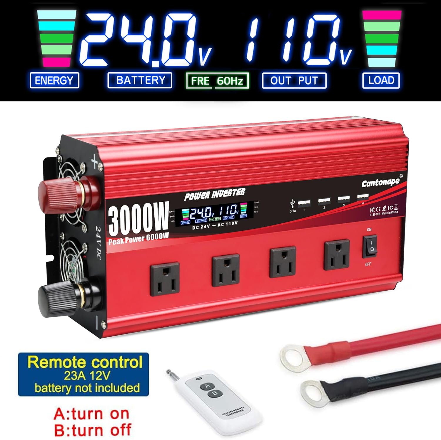 - POWERFUL OUTPUT: Convert power of DC 24V to AC 110V/120V 60Hz. Provides 3000 Watts continuous modified sine wave power and 6000 Watts surge power. Featuring 4 AC outlets and 4 USB ports for multi-purpose charging. Great High efficiency: conversion efficiency > 90%. The rated output power of this device is 3000W, it could definitely be realized in reality.