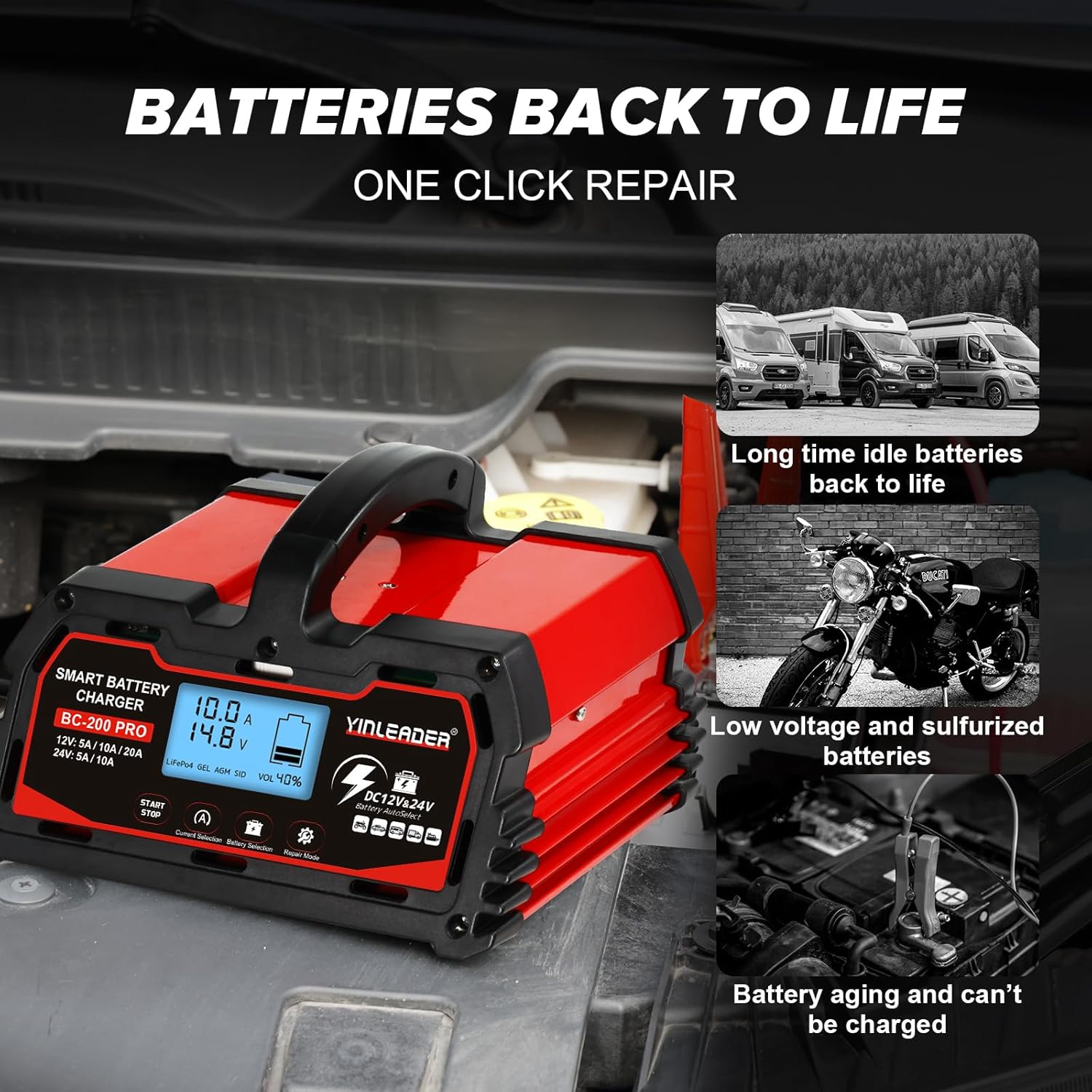 - 【Wide Range of Applications】It offers a variable charging current of (12V-5A/10A/20A)/(24V-5A/10A) battery charging, allowing you to choose the appropriate current for your battery size. Suitable for charging and repairing lead-acid batteries, including AGM, STD, GEL, SLA, etc, in cars, trucks, SUVs, motorcycles, lawnmowers, boats, and more.