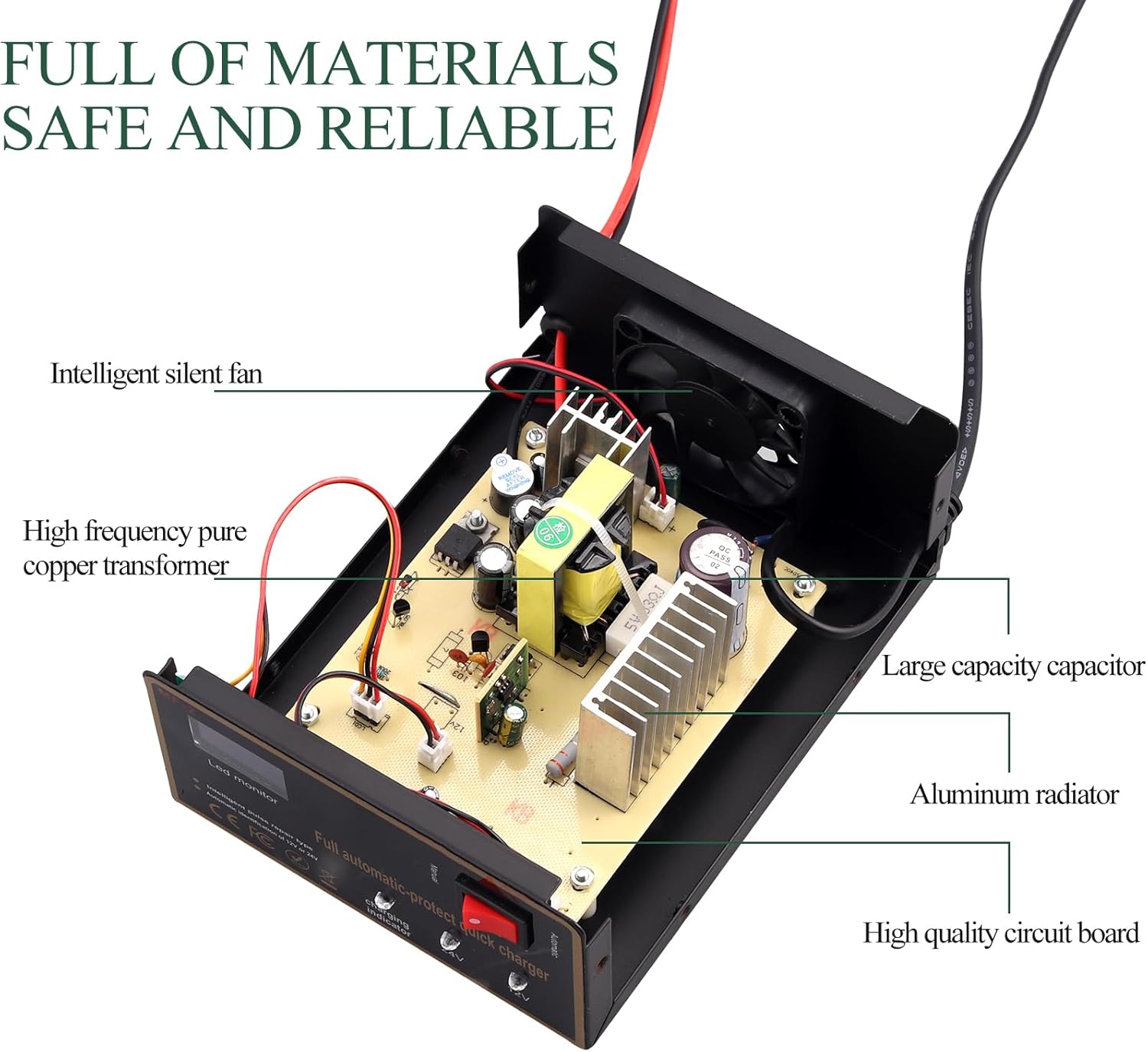 - 【Intelligent Safety Protections】The 6V battery charger Safety features include built-in circuit protection against reverse polarity, sparks, overcharging, low voltage protection, over-current, interruption, short circuit, and built-in silent cooling fan offers heat dissipation.Battery Charger is suitable for use in multiple climate regions. Working temperature is 32°F (0°C) - 104°F (40°C)