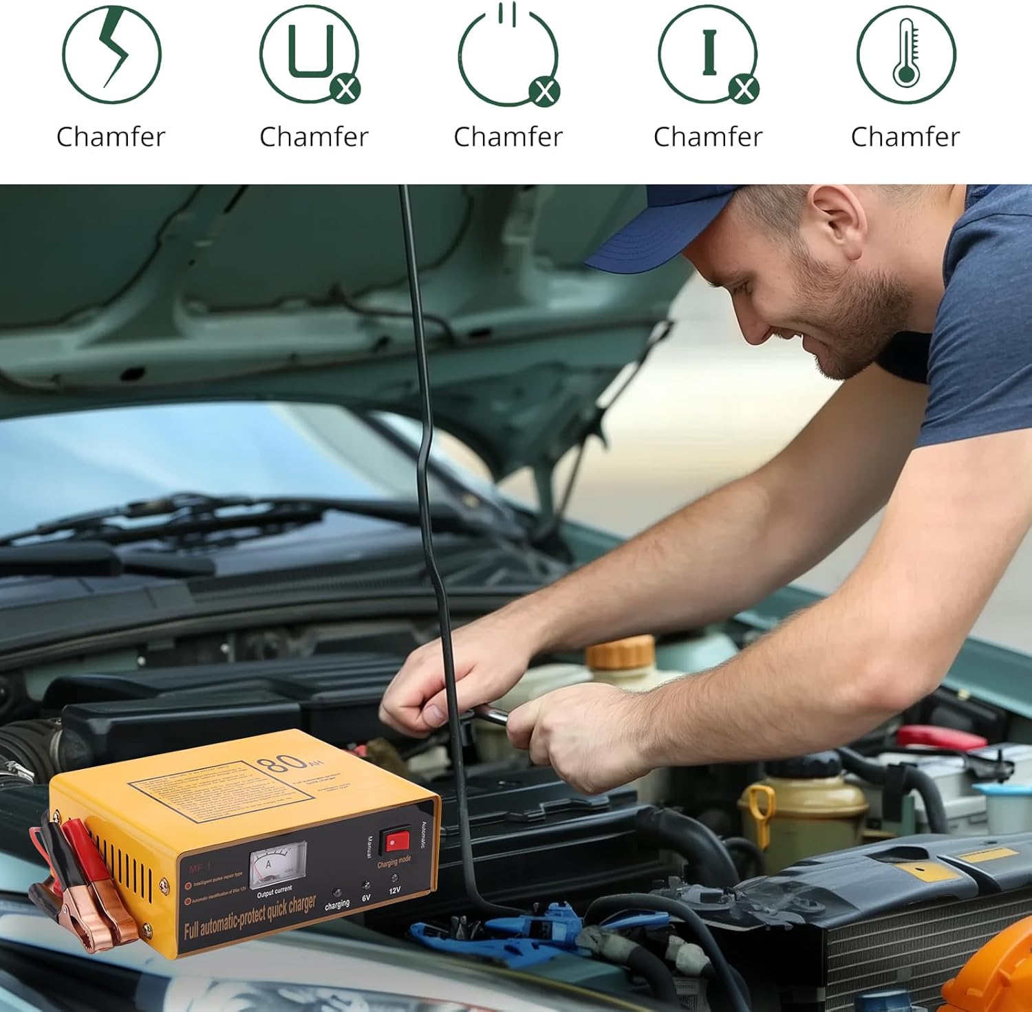- 【Intelligent Safety Protections】The 6V battery charger Safety features include built-in circuit protection against reverse polarity, sparks, overcharging, low voltage protection, over-current, interruption, short circuit, and built-in silent cooling fan offers heat dissipation
