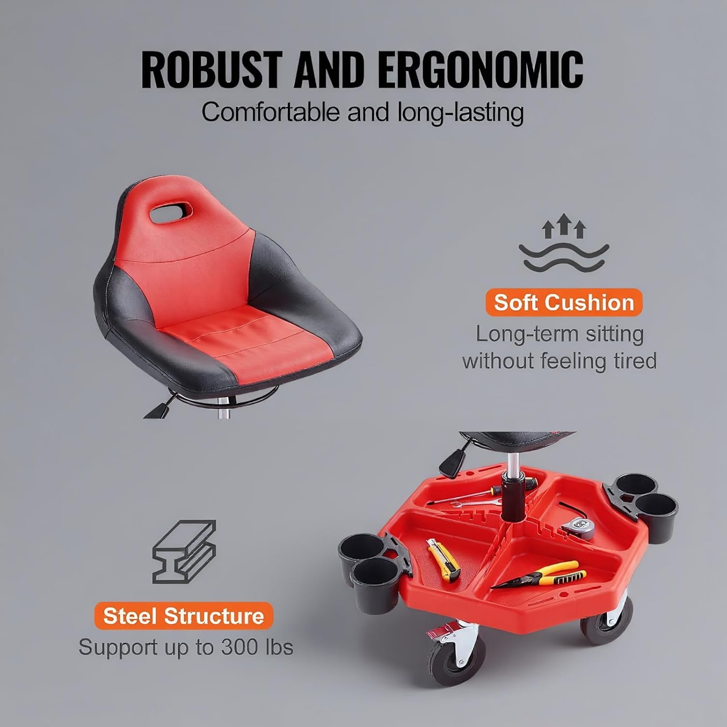 - 300 LBS Rolling Garage Stool: If you're spending lots of time sitting in a garage or shop, it's definitely worth investing in an ergonomic rolling shop stool. The garage stool would be great for any projects you have to bend over. You can sit down and work instead of squatting. This 300 lbs capacity allows an adult to sit down securely. You can finish exterior jobs much easier.