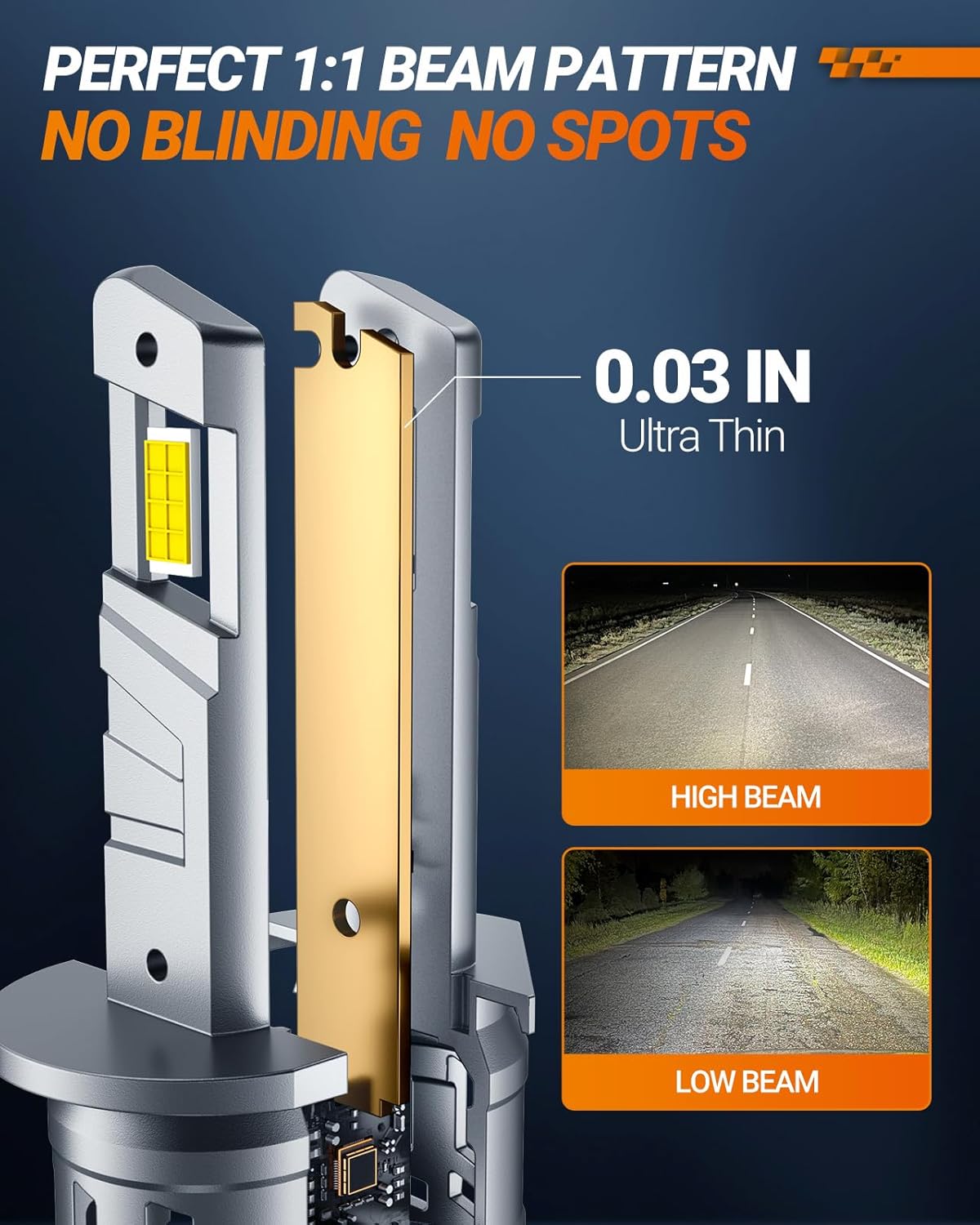 - 【Pefect 1:1 Lighting】The 0.03-inch ultra-thin copper substrate addresses issues like flickering and dimming. The focused lighting minimizes disturbance to oncoming traffic, enhancing safety on the road