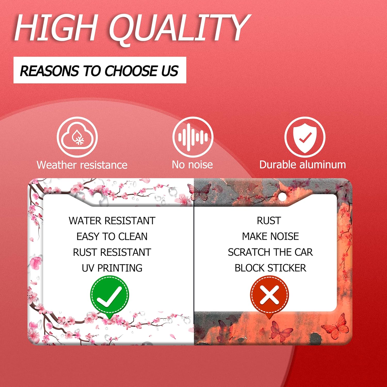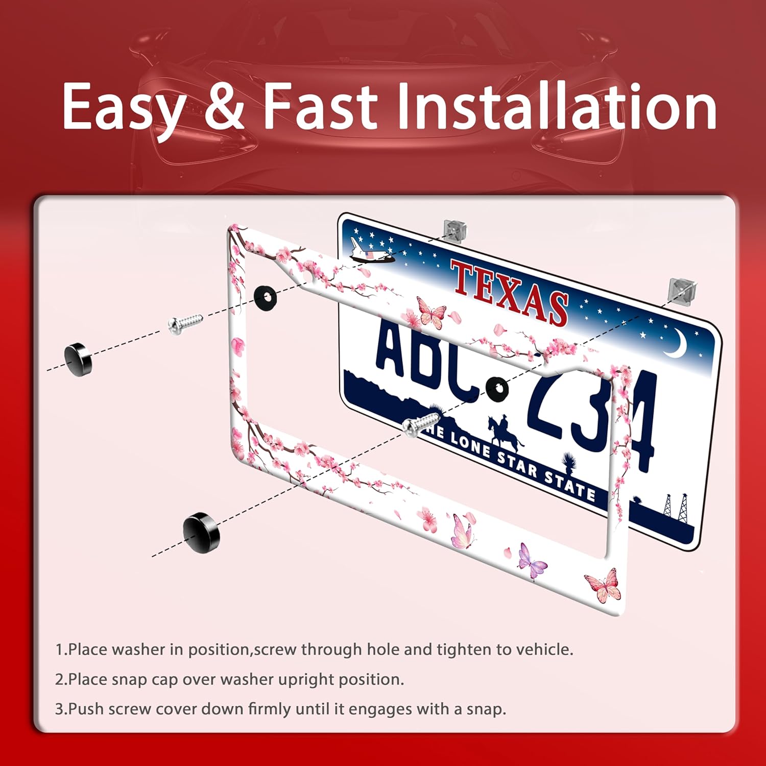 Pink Cherry Blossom Butterfly License Plate Frame Beautiful Flowers License Plate Holder Funny Stainless Steel Accessories Cars Decor With 2 Holes And Screws Fits Standard Us Ca Vehicles 12.2 X 6 Inch