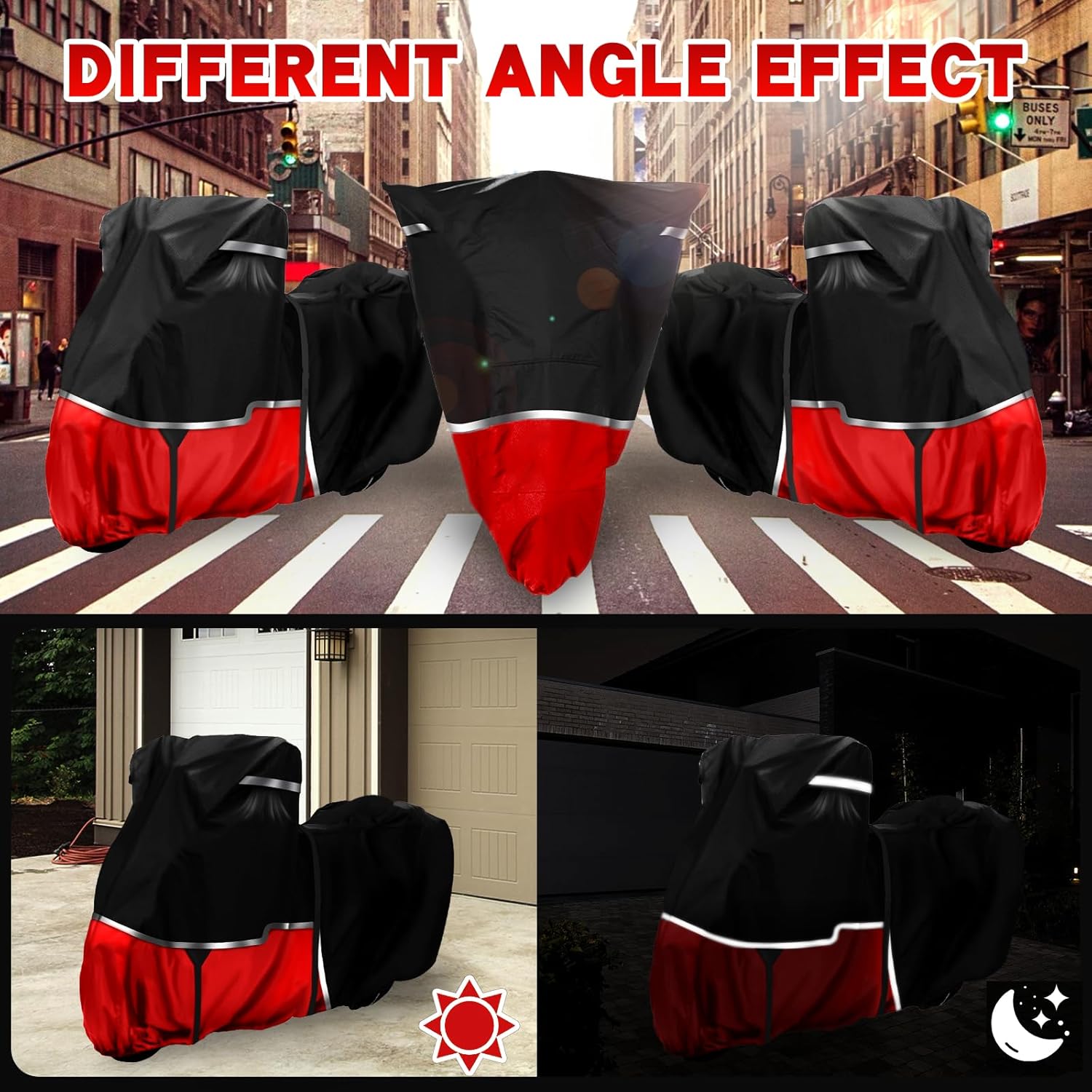 - Package Contents and Usage Tips: This set includes a heavy-duty motorcycle cover with adjustable buckles, reflective strips, ventilation holes, and a keyhole. For best results, allow the engine to cool before using the cover to prevent heat damage. Designed for all-weather protection against rain, wind, UV rays, and dust