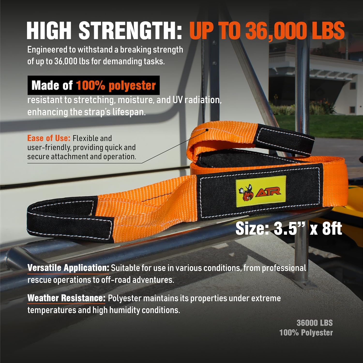 ATR Tree Saver Strap 3.5" x 8ft – 36,000 lbs Break Strength, Heavy Duty Tow Strap for Winch, Off-Road Recovery, Truck, Jeep, Short Polyester Recovery Rope with Loops
