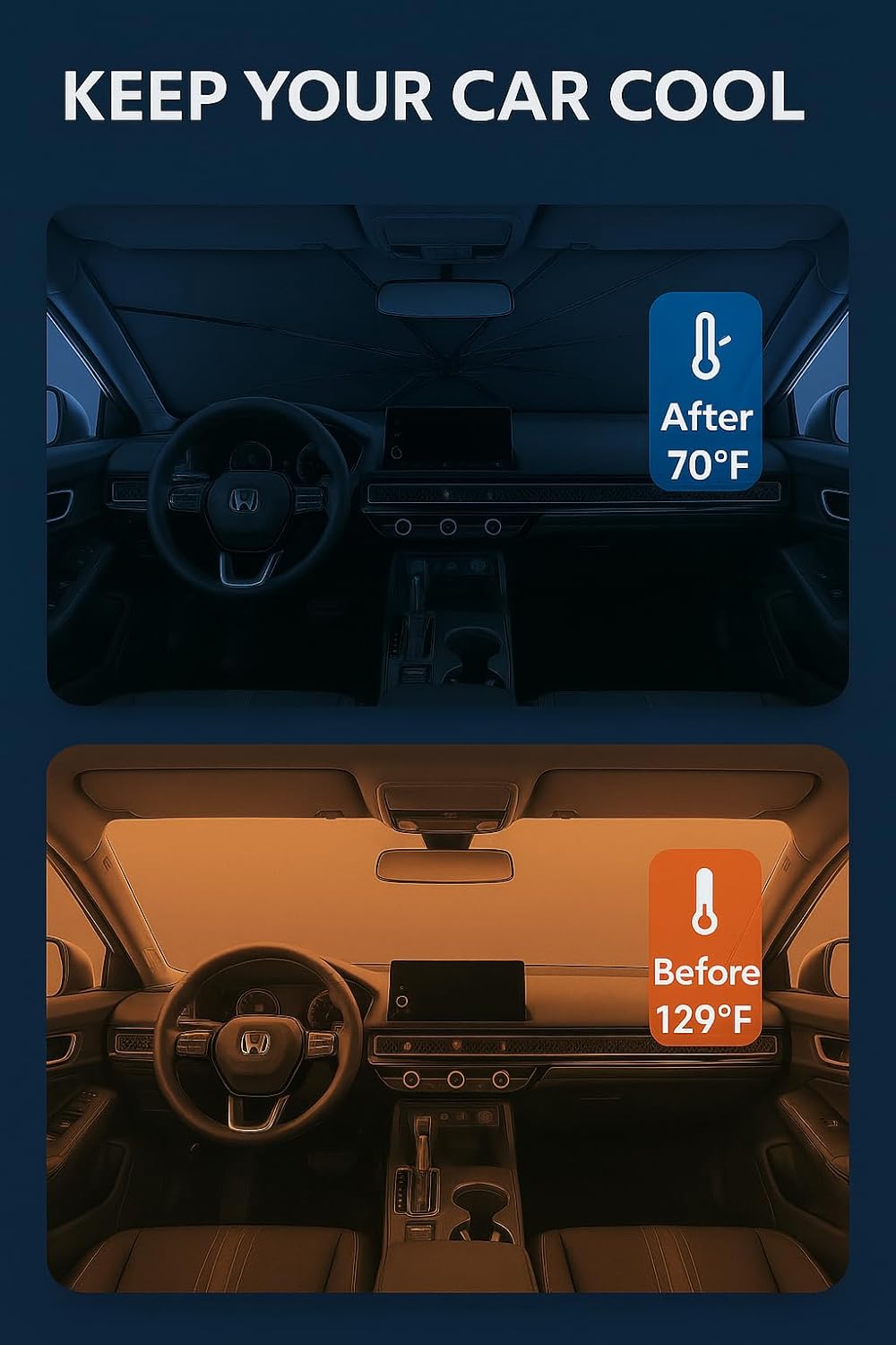 - Innovative Ice Crystal Material: The sunshade adopts a 4-layer design, which is thick enough to effectively block and reflect sunlight. After multiple uses, it is still strong and not easy to tear. The sunshade also uses innovative ice crystal materials to evenly distribute heat, quickly cool down, and keep your car cool all the time. You no longer have to worry about getting your seat or car handle scalded by high temperatures.