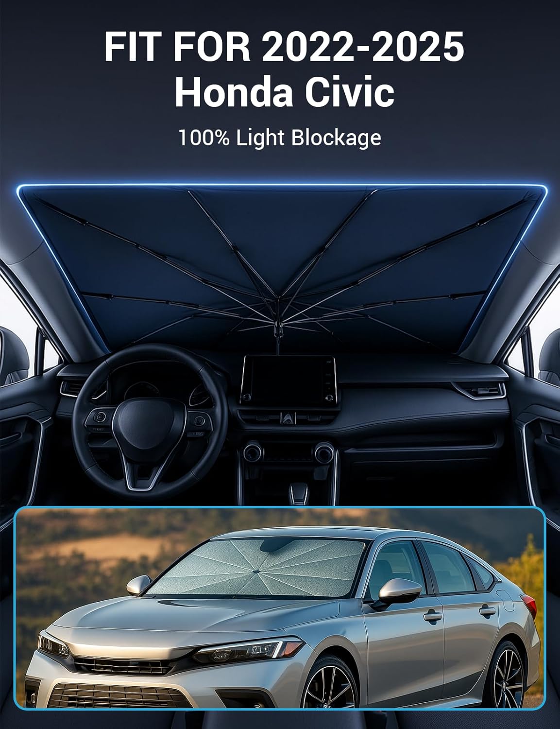 - Certified Sustainable. Customized Windshield Sunshade: Specially designed for the 2022-2025 Honda Civic with precise mirror cutouts, providing 100% shading, carbon fiber handle, ensuring lightweight and durability while also having a fashionable feel. Our Civic windshield sunshade can protect the interior of your car from various light damage and prevent dashboard and seat degradation.