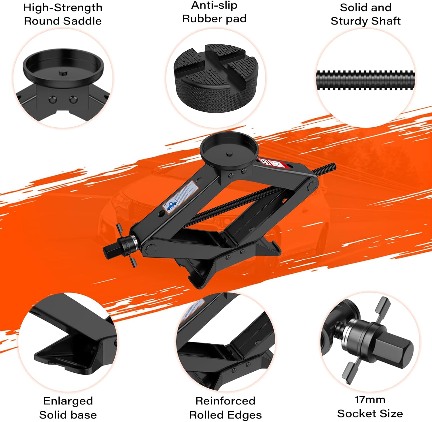 - 【Effortless Operation】The scissor jack with Ratcheting Handle Save more effort when lifting a car while the lug wrench and tire changing kit are designed to provide a comfortable grip and maximum leverage.