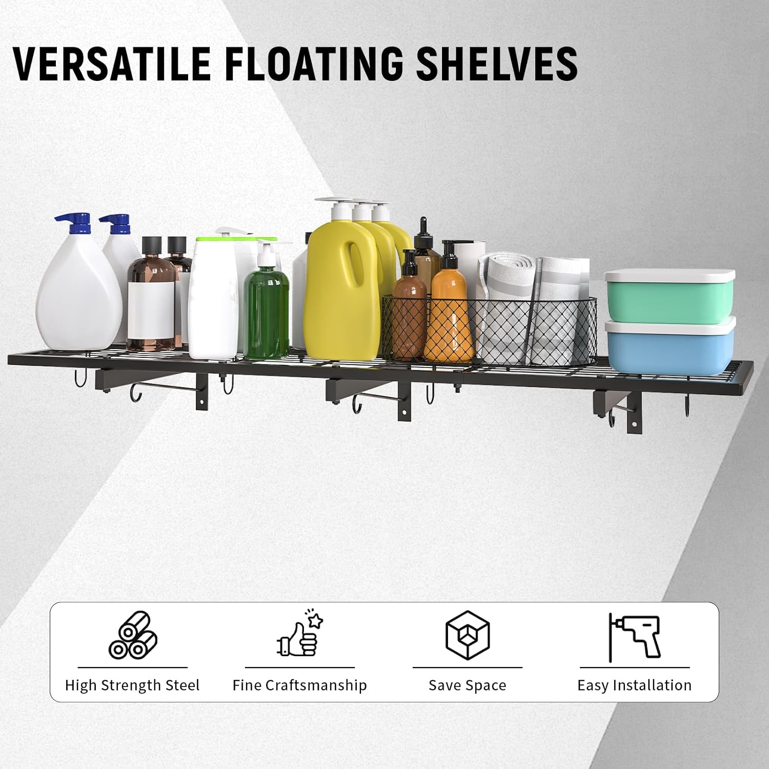 - SPACE-SAVING DESIGN: Measuring 46" x 12.5", the floating shelf is perfect for maximizing vertical space in garages, basements, or laundry rooms, helping to keep your area organized and clutter-free.
