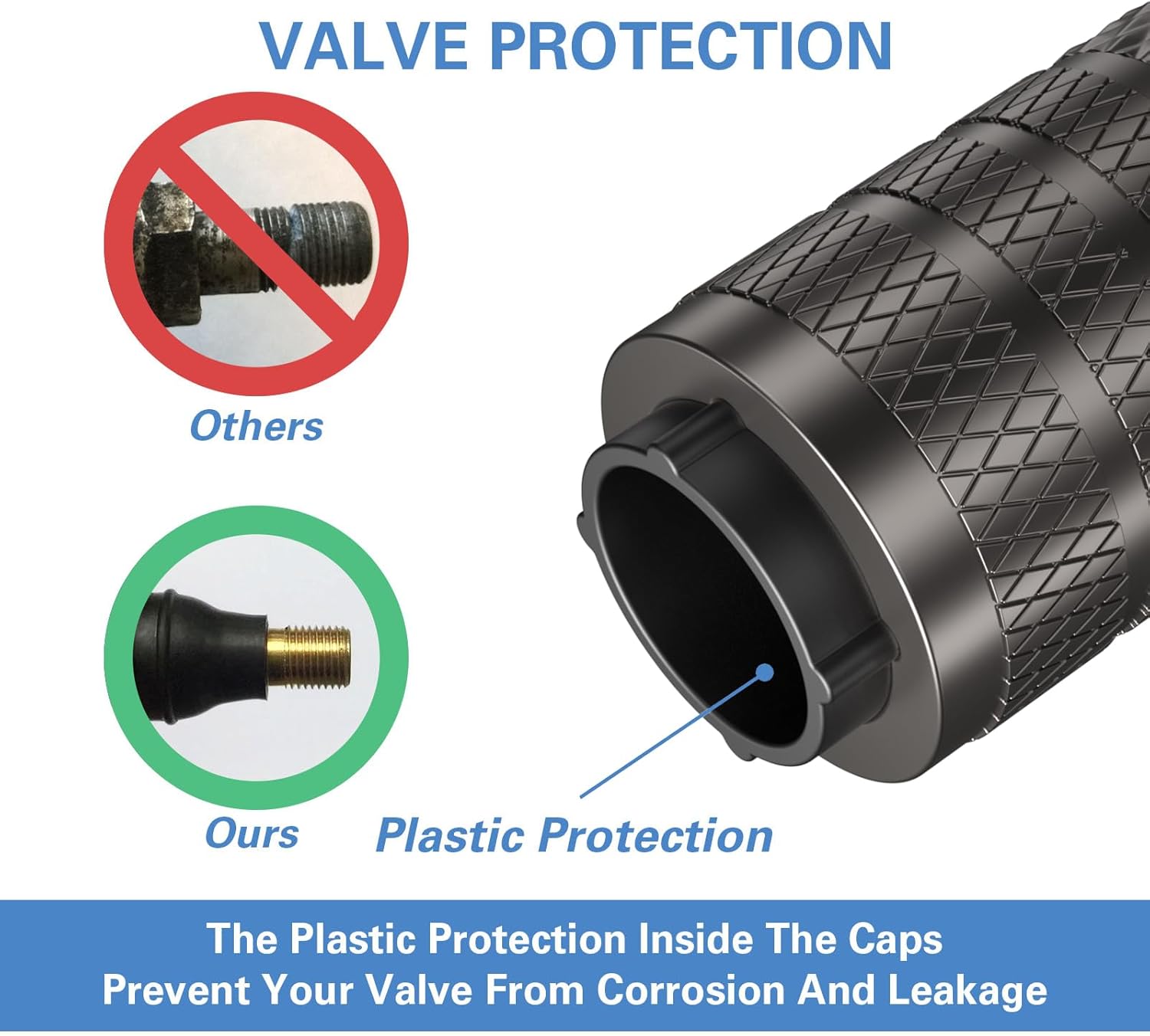 - Special Design – Metal materials are prone to rust in the presence of water and oxygen, which may lead to corrosion on valve body. The plastic inner valve caps design combines the attribution of corrosion resistance of plastic and the stylish look of metal.