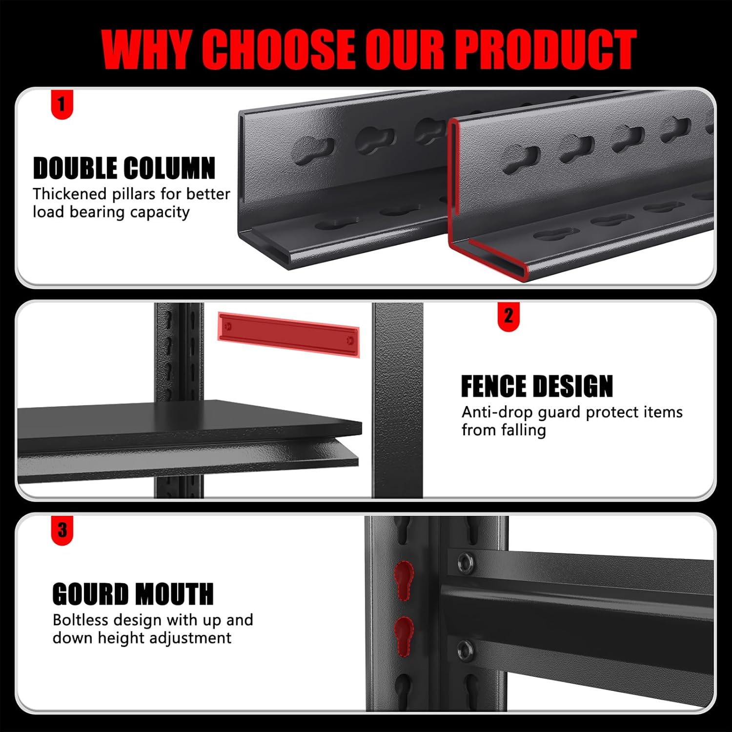 - 【Double-Layer Post Design – Protect Your Hands】Say goodbye to flimsy single-layer post shelves that scratch easily. Our double-layer post design ensures thicker, higher-quality columns while safeguarding your hands from cuts and scrapes