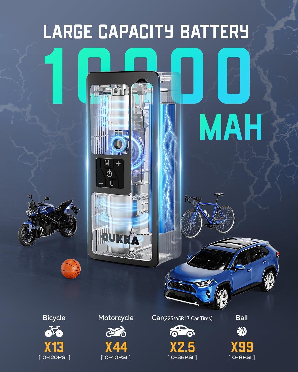 - [150PSI High Pressure&Fast Inflation]: The P009 tire inflator features a 25-cylinder design and a high-capacity 10000mAh rechargeable battery. This air compressor increases inflation efficiency by 40%, 4×faster inflation saves you time and effort. P009 electric air pump fills a 225/65R17 car tire (30-36 PSI) in just about 1 minute. 150 max high-pressure air poump, ideal for pickup trucks, SUVs, cars, motorcycles, bikes, and balls