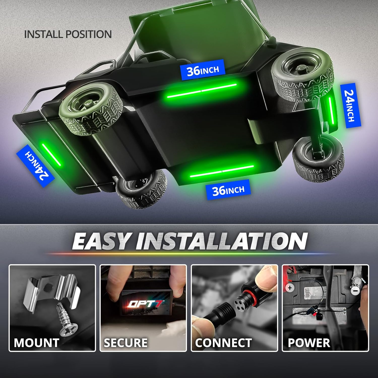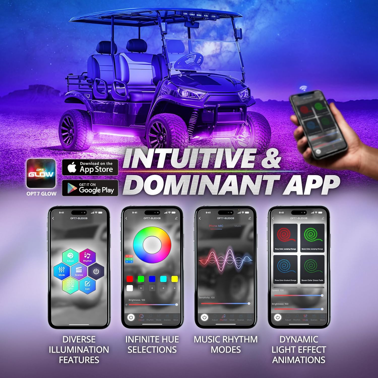 OPT7 Aura Pro Underglow Lights Kit for Golf Cart with APP & Remote Control, Waterproof Rigid Aluminum Light Bar, RGB Multicolor Music Sync LED Lighting Kit for EZGO Yamaha Club Car, 12V