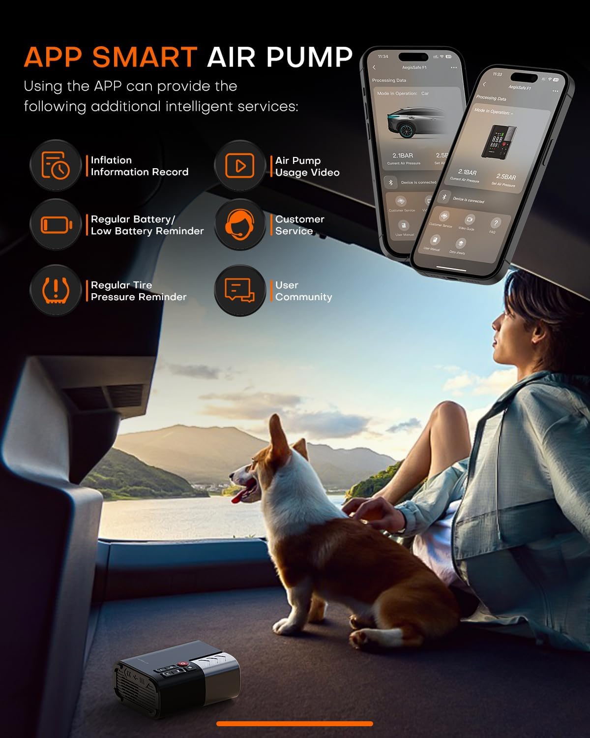 - đąăAPP Smart IoTăThe exclusive APP for you can intuitively understand the status of the car tire air pump portable, provide air pump information records, status reminders, warnings, usage instructions and customer service, etc., which will help you solve your troubles in use and get more comprehensive protection. âTips:Not using the APP will not affect the normal use of the air pump.