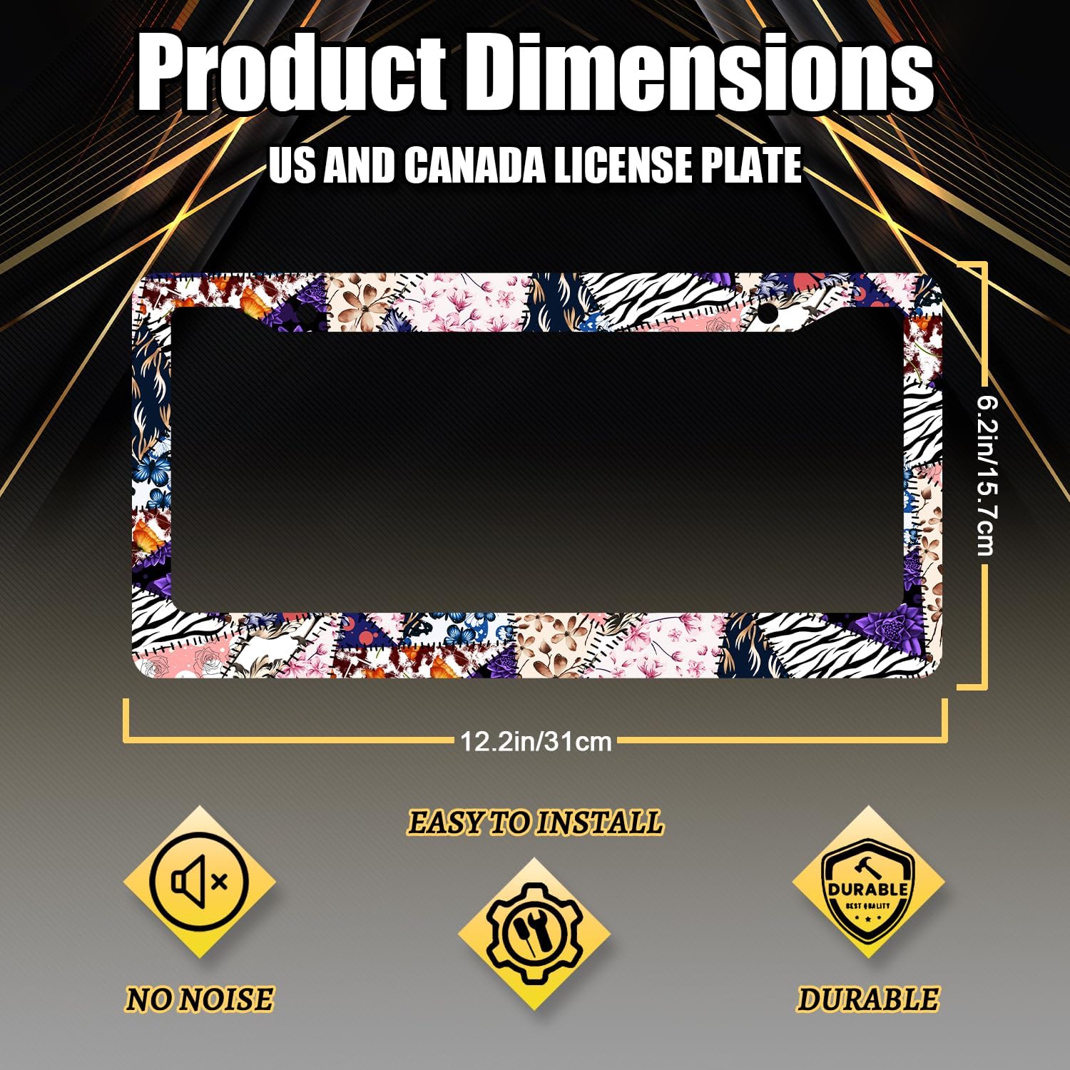 - Size: The size of the license plate frame is 12.3" x 6.3" , it fits all standard size US and Canada vehicle license plates.Fashion design frame fits perfectly on your car license plate.