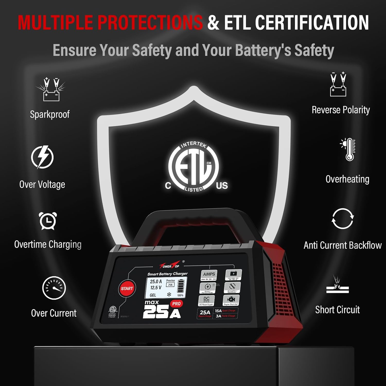 - Plug-and-Play, Beginner-Friendly: Simply connect the 12 volt battery charger to AC power and your battery. No extra steps needed. The battery chargers will automatically detect the battery status and start charging in 30 seconds. It switches to maintenance mode after full charge, with zero overcharging. You can also set it manually. Built-in protections include reverse polarity, spark-proof, overcharge/discharge, overvoltage, overcurrent, overload, overheating, current backflow, short circuit, and more. ETL certified. Safe to use without any electrical knowledge