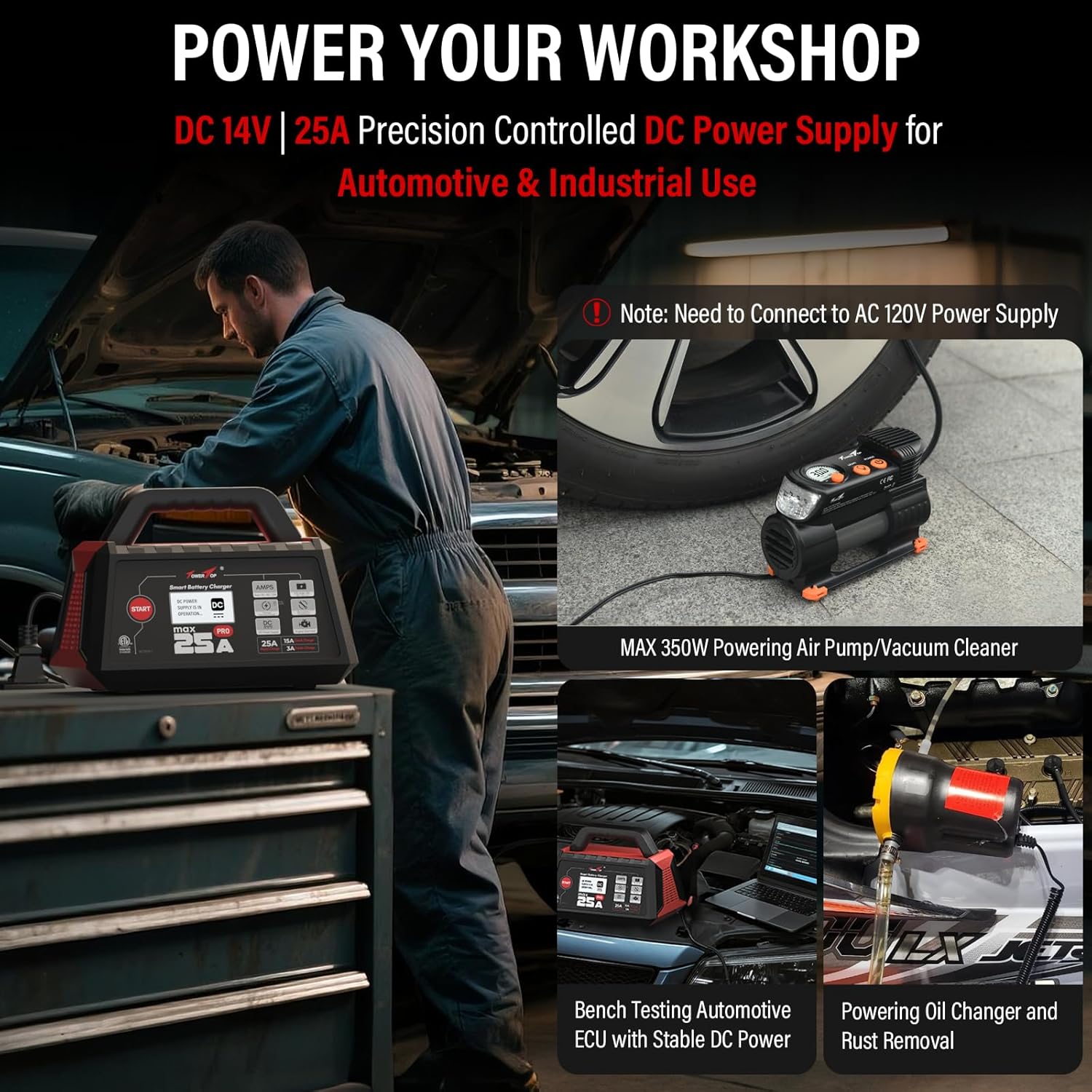 TowerTop 25A Max Pro Battery Charger: 12V Fully Automatic Smart Trickle Charger, Automotive Battery Maintainer with Engine Start, DC Supply, Winter Mode, Recondition,Desulfation, for Lead Acid/Lithium