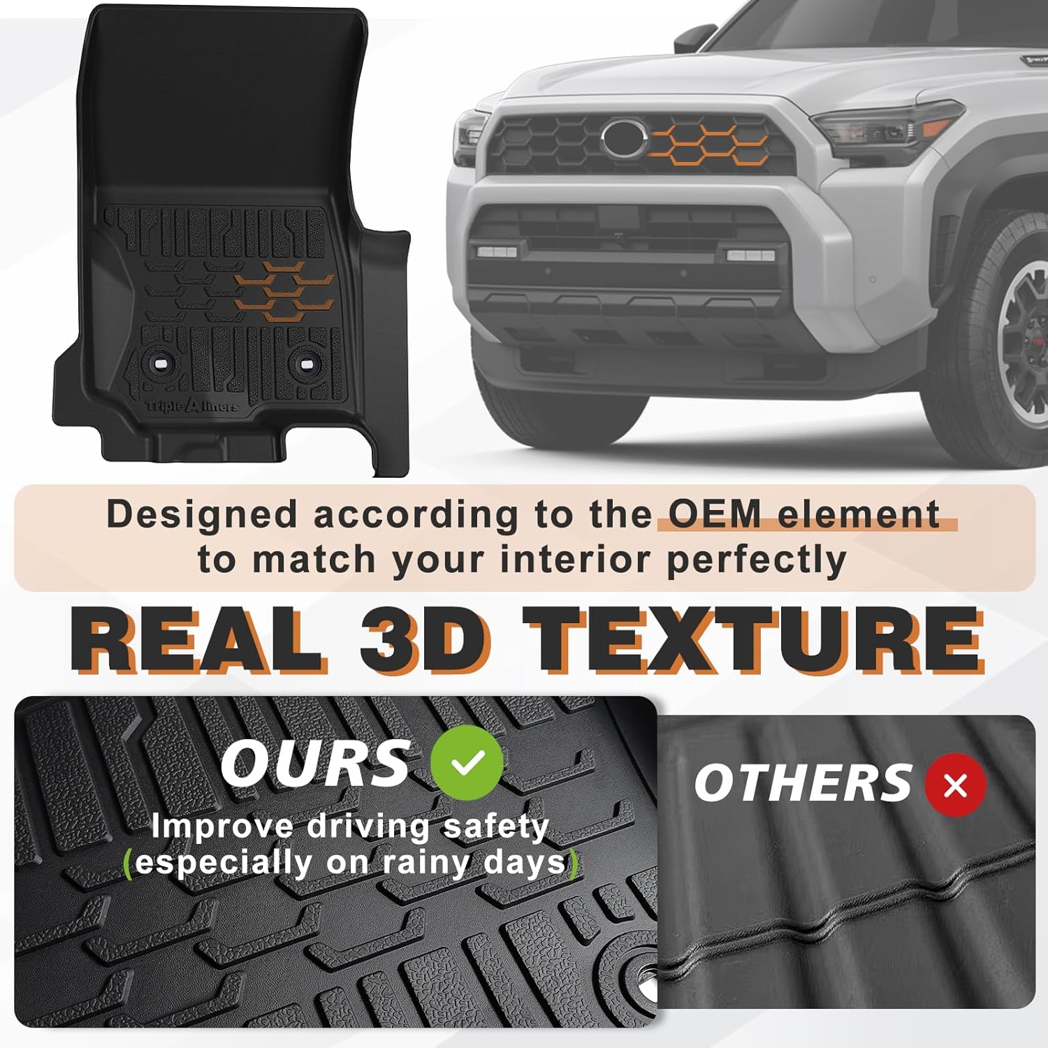 - FortiGrip Material: Our mat is crafted with TripleAliners Patent Pending FortiGrip Material, which has a 25% increase in wear resistance and it is tested and proved that it could better prevent items from sliding on the mat compared with regular material in the same production way.