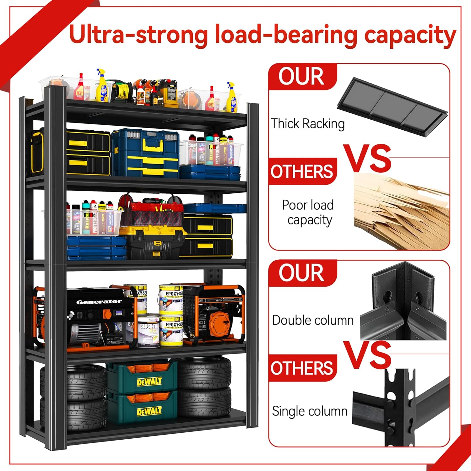 - 【 Upgraded Dual-Layer Columns for Enhanced Stability】 Unlike standard shelves on the market that use single-layer columns, our product features upgraded dual-layer columns that significantly boost stability and load-bearing capacity. The reinforced structure helps distribute the weight evenly, reducing the risk of warping or sagging over time. This ensures the shelf remains stable even under heavier loads. In comparison, shelves with single-layer columns can wobble or bend when storing heavier items, making them less reliable for larger, bulkier tools or materials