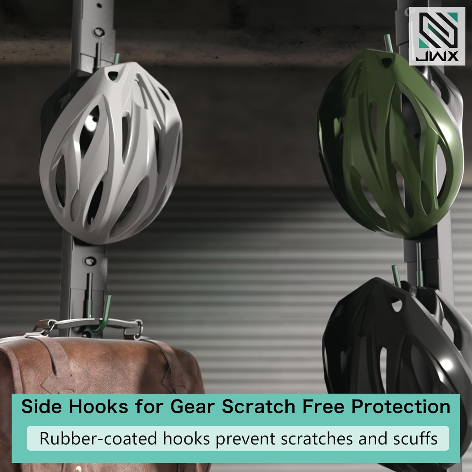 - 【Fully Adjustable Hooks for Any Bike Type】 Our signature green, rubber-coated hooks are not only eye-catching—they’re also fully adjustable. Customize spacing with threaded locking knobs to easily fit fat-tire bikes, e-bikes, kids’ bikes, or road bikes without handlebar interference.
