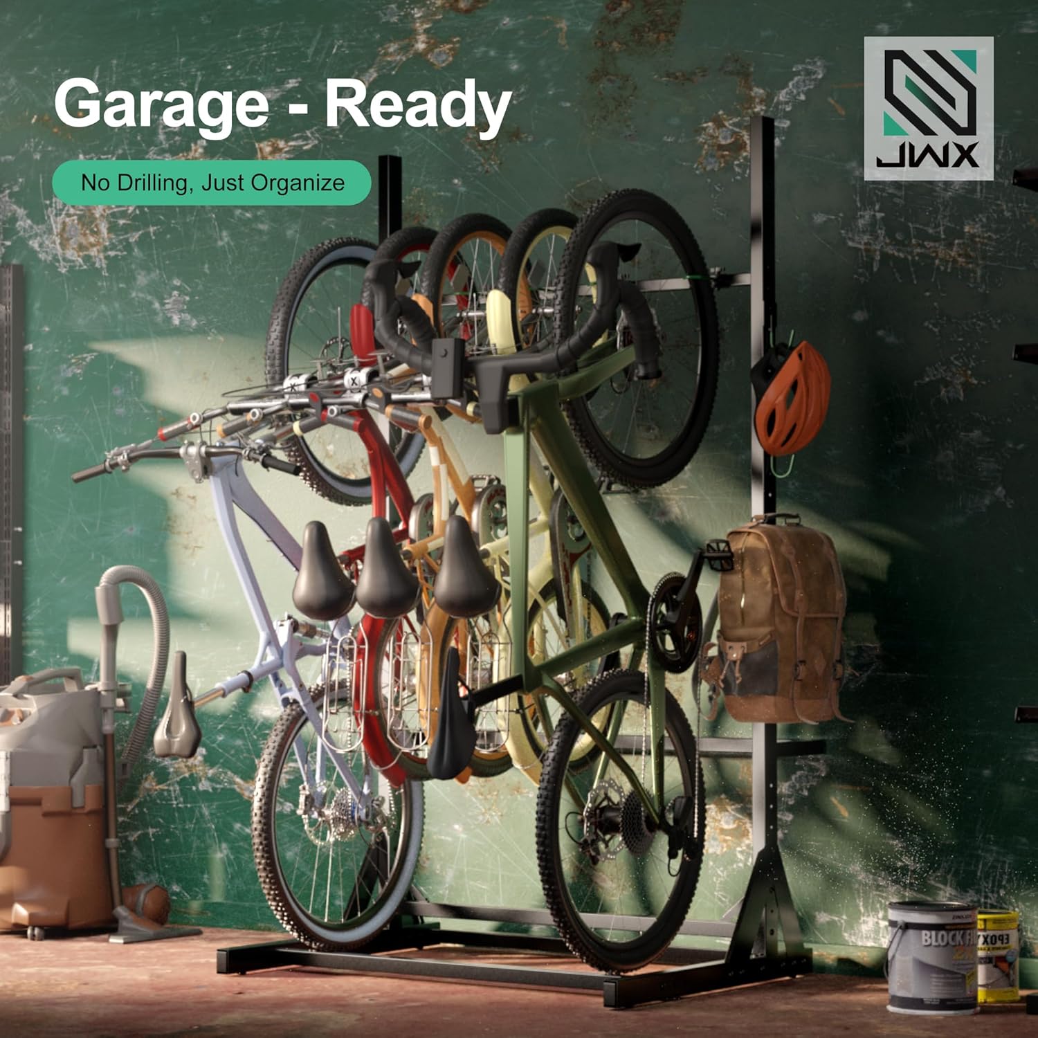 - 【Built to Last – Holds 5 Bikes, Up to 350 lbs Total】 Heavy-duty steel meets real-world testing. Each JWX rack holds 5 bikes up to 70 lbs each. Whether you’re storing e-bikes, mountain bikes, or hybrids, this rack handles the weight without compromise.