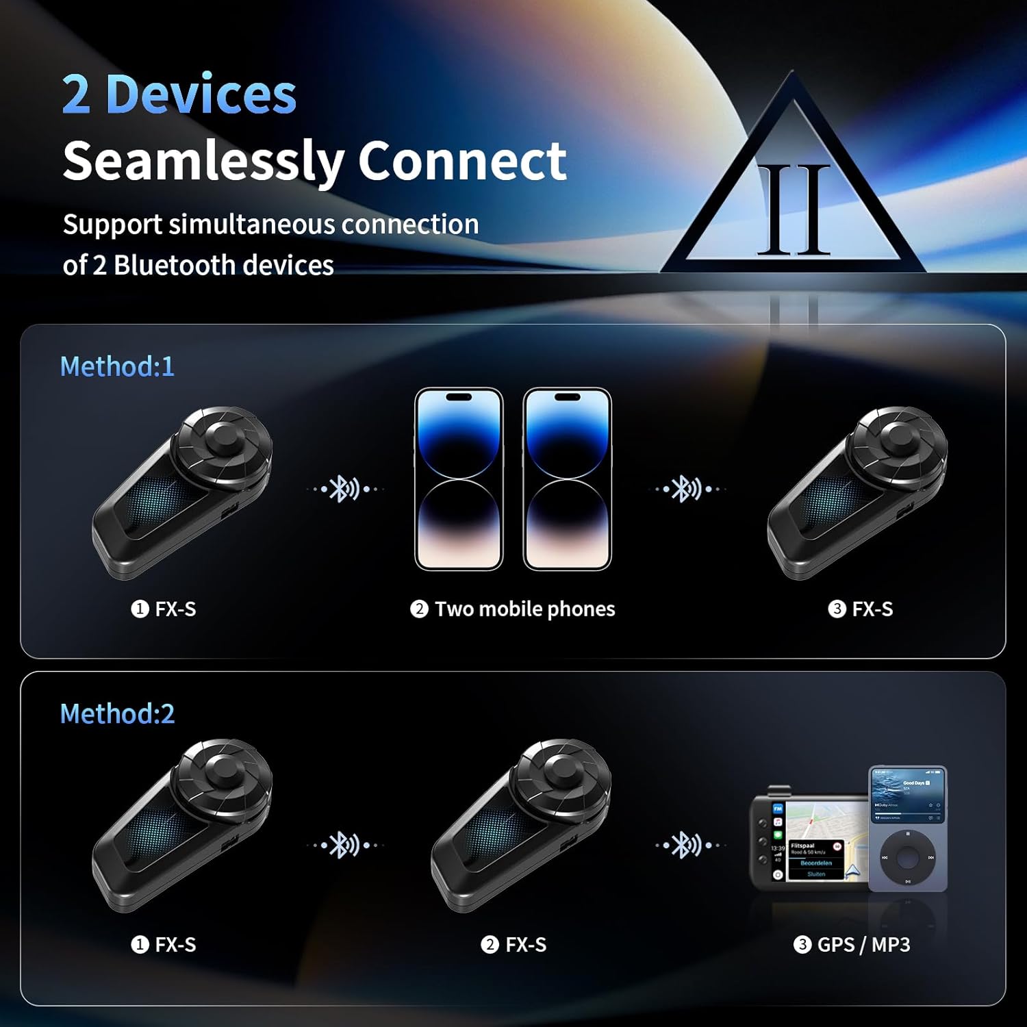 - Advanced BT 5.4 Chip, 2-Way Intercom: FX-S motorcycle Bluetooth headset adopts state-of-the-art Qualcomm Bluetooth 5.4 chip, it provides more stable signal and wide range with low latency. Support 2 riders to enjoy clear calls and music up to 1000m