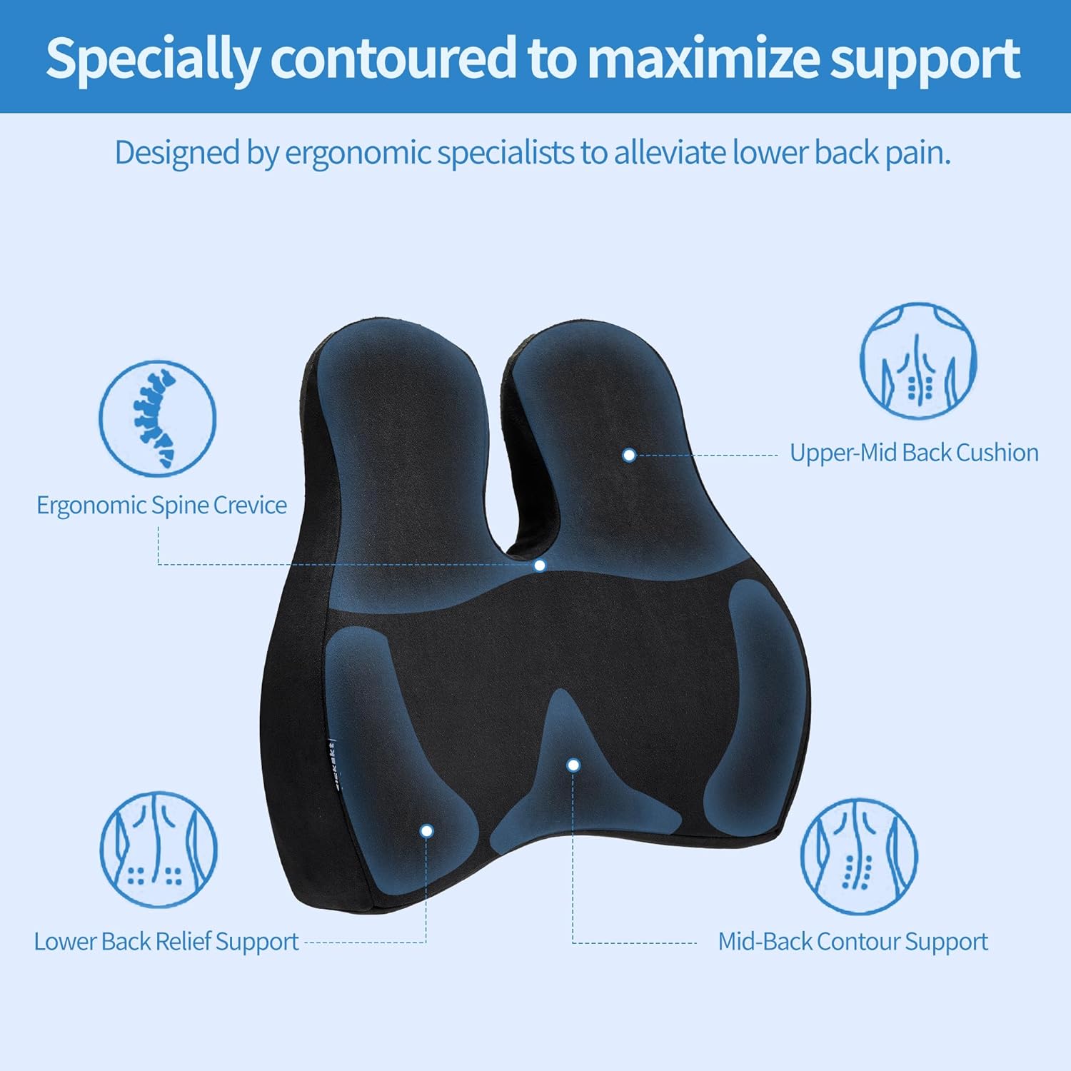 - Ergonomic Design for Optimal Support: Specifically designed to support the natural curve of your spine. Our lumbar pillow provides firm sectional lower, mid, & upper mid-back support to jointly keep your back & spine in ideal posture, reducing strain on your back muscles.