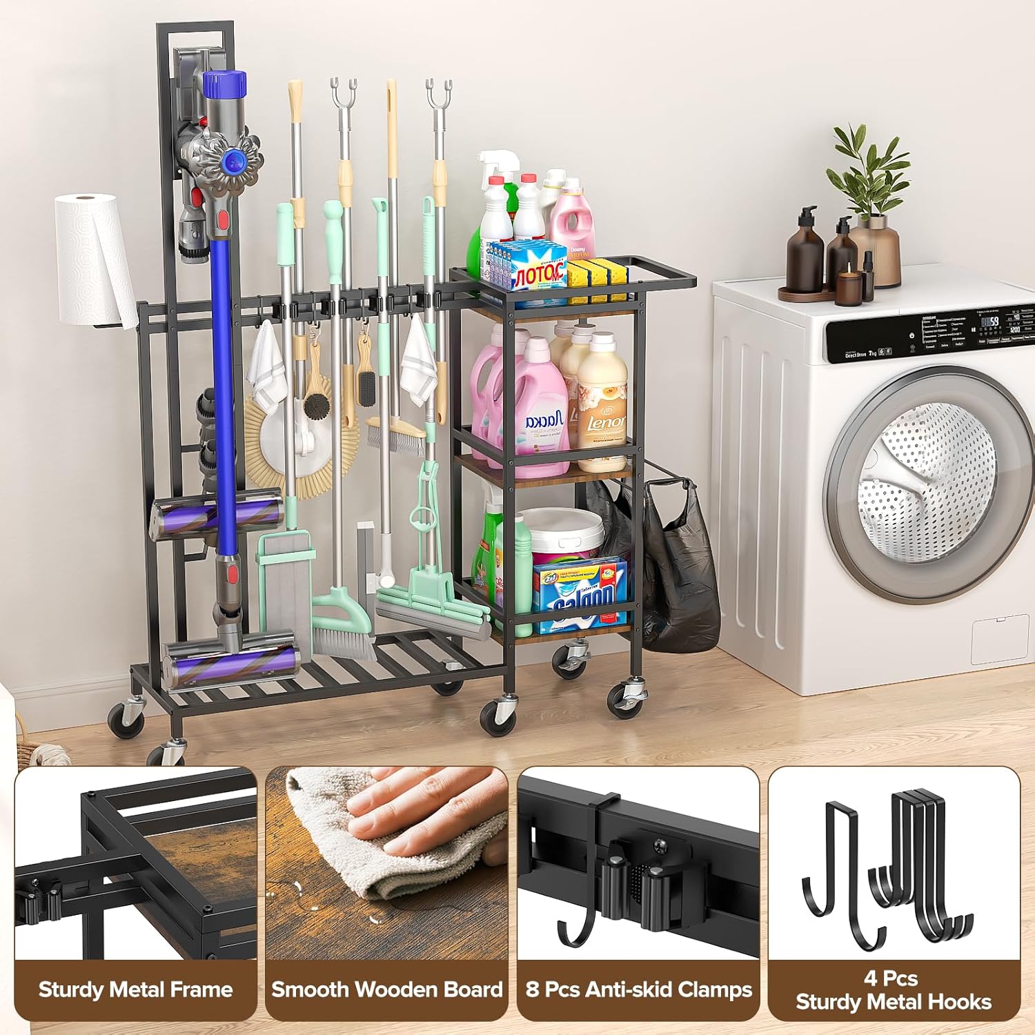 Cleaning Utility Cart on Wheels, Multifunctional Cleaning Tools Supplies Organizer with Broom and Mop Holder, Vacuum Stand Compatible with Dyson, Rolling Storage Caddy Cart for Home