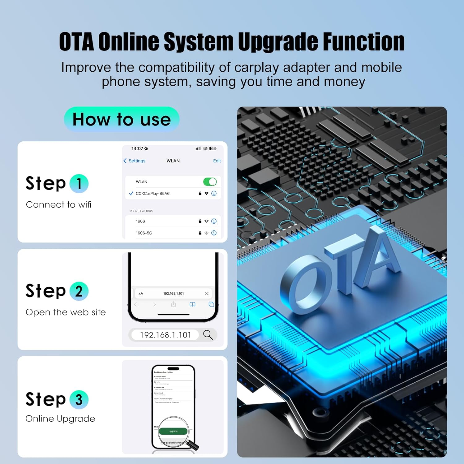 - 【Multiple Control Items】The apple car play wireless adapter retains the four original controls of the car voice assistant, steering wheel, touch screen, and central control button, making your operation safer and more convenient during driving. Also,the wireless carplay adapter supports OTA upgrades to improve the compatibility of the IOS system and wireless carplay, and can be quickly upgraded separately without additional costs