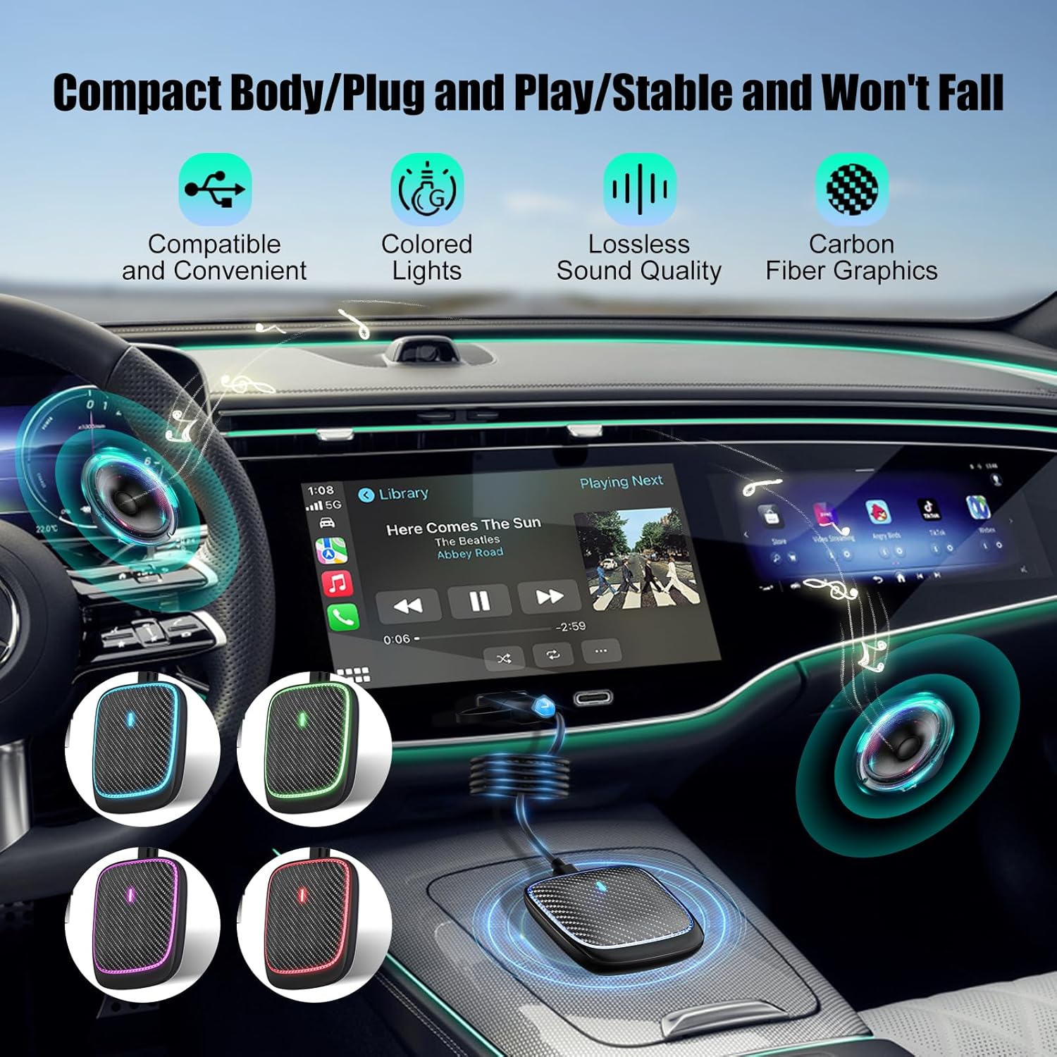- 【Compact Stylish Design】The mini wireless carplay adapter does not take up space and easy to setup. Wireless design allows you to say goodbye to the messy wired countertops. The car play wireless adapter equipped with coloured lights design to add richer visual effects to the car.Also this wireless carplay adapter for iphone uses carbon fiber graphics are stronger and lighter, making the wireless carplay adapter appearance looks more sporty