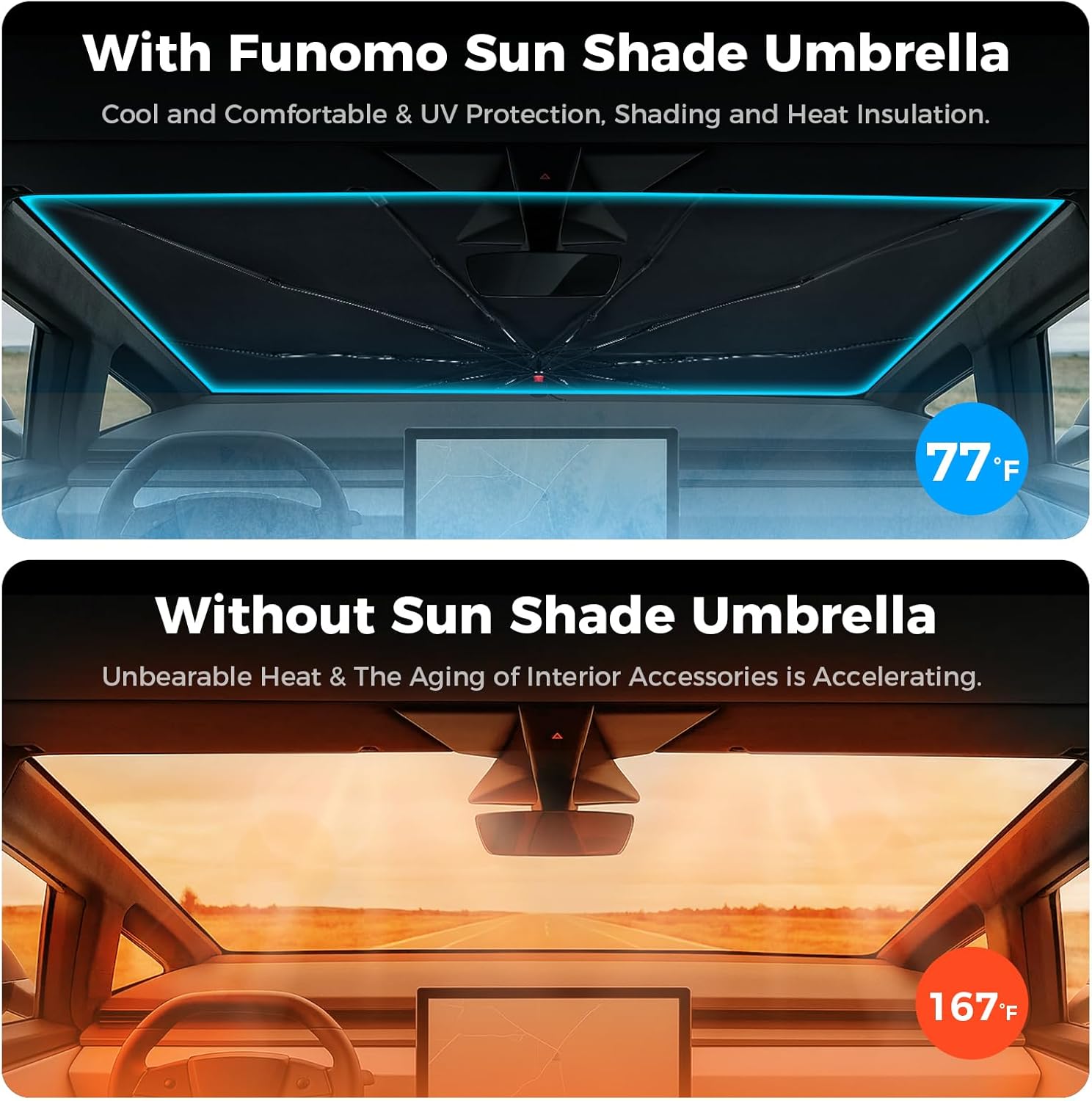 - Sun Protection: Our Cybertruck Windshield Sun Shade Umbrella features a double-layer design, with a silver restaurant layer and a black insulation layer that can block 99% of UV rays and heat. Ensure that the interior of the car remains cool under the scorching sun to prevent sunburn and extend the lifespan of car interior components