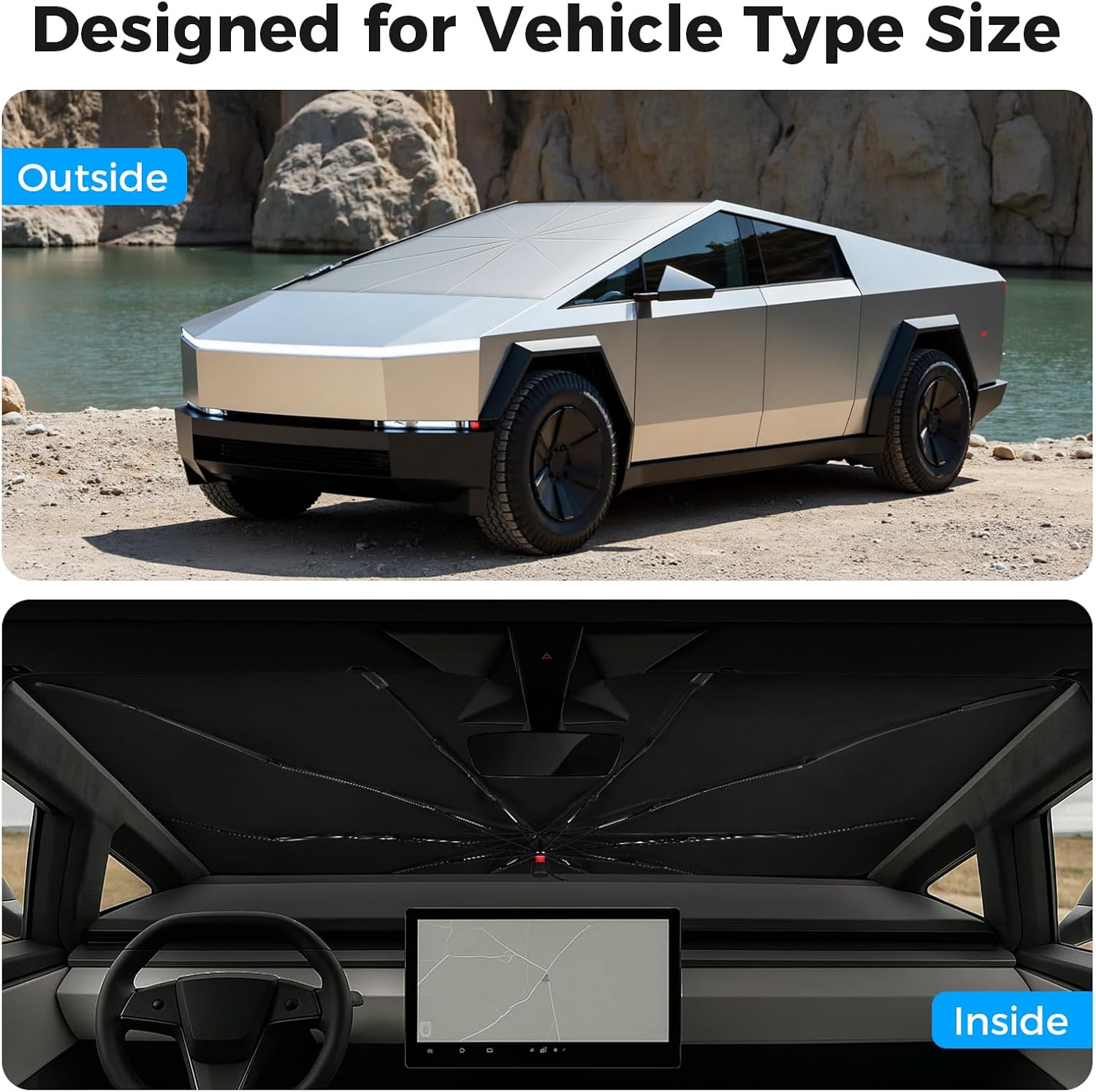 - Customized Fit: Size 54x60x61inches.Windshield sun shade umbrella is custom designed for the 2024 2025 Tesla Cybertruck sunshade and is suitable for the front window of the 2024 2025 Cybertruck accessories.